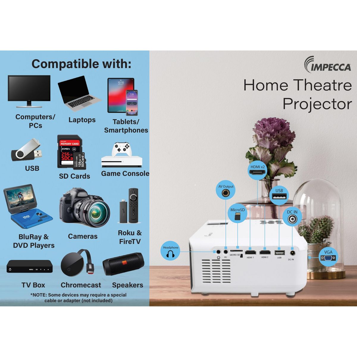 Impecca Portable Home Theatre Projector - 160 ANSI Lumens/ 720p/ Up to 1800p via HDMI