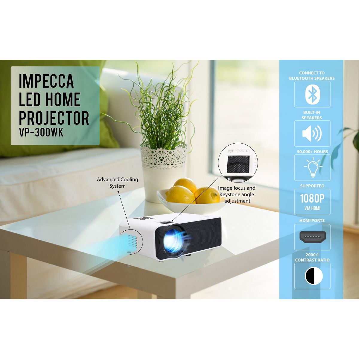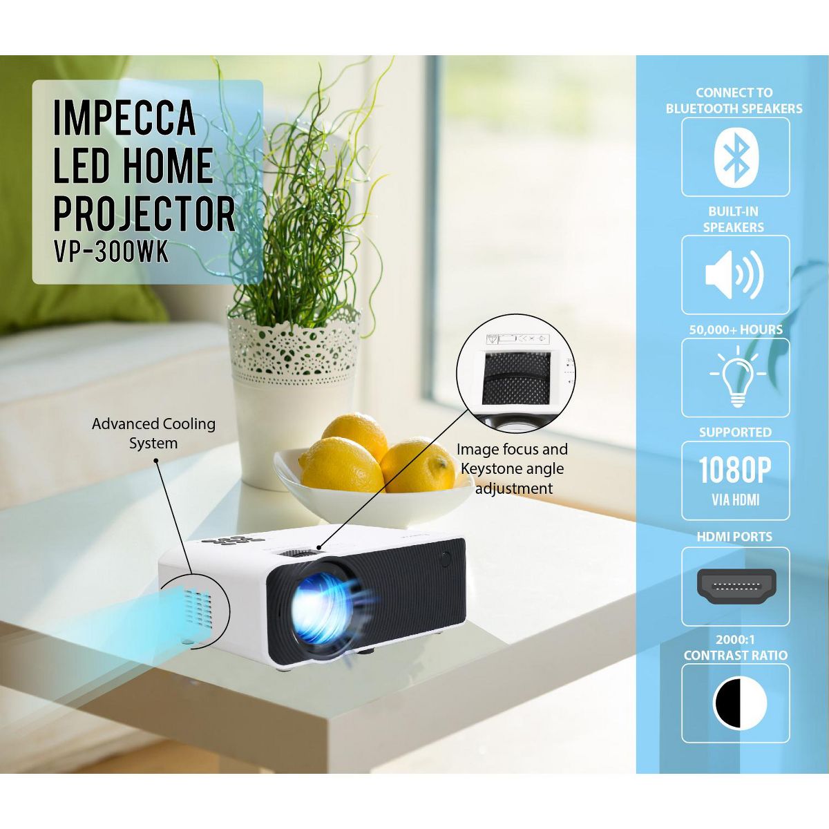 Enjoy quality content with the LED Home Theatre Projector! This projector utilizes advanced technologies and convenient setup utilities to deliver clean and clear presentations whether for business presentations, educational purposes, or simply, family entertainment. Experience vivid picture quality and pristine clarity. Easily connect wirelessly to a Bluetooth speaker for amplified sound. You can enjoy up to 1080P supported through HDMI inputs.