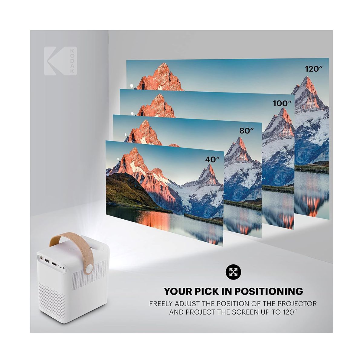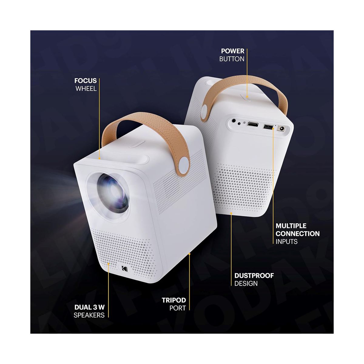 The KODAK FLIK HD9 Mini Projector with Wifi and Bluetooth can play files from the USB or HDMI® connection ports and supports streaming videos over a Wi-Fi connection. Connect compatible devices wirelessly to mirror your screen with this smart indoor or outdoor projector. View your movies on a proportional screen, no matter the surface on this portable small projector. The Auto keystone correction of the home projector ensures your screen will always show correctly, even if the display surface is warped. And of course, control everything with the sound of your voice using the included voice-powered remote control of the portable projector.