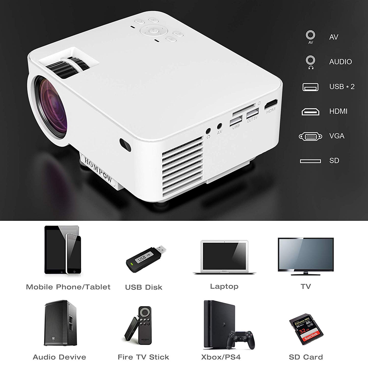 HDMI,VGA,USB, AV, TF Card, TV BOX, 1080P Supported