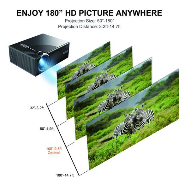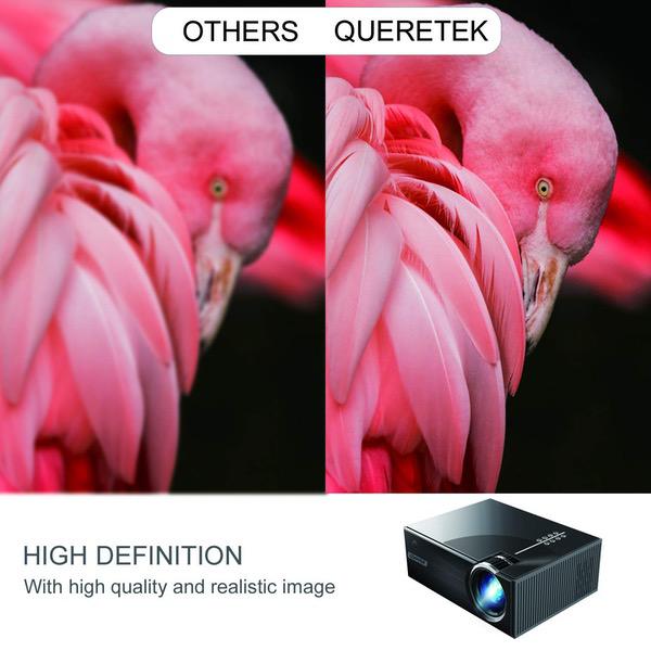 - [Higher Clarity & Resolution for Better Visual Experience]: Queretek Projector utilizes the brand new LED light source and LCD display technology, which significantly reduces light attenuation and provides +80% brightness and sharper image +30% than ordinary projector. 50-180” big screen display at the distance of 1.0M-4.5M. (the recommended viewing distance is 3.0M with 100”display.) It is ideal HD projector for home entertainment ! (Notice: Not recommend for PPT or office presentation.)