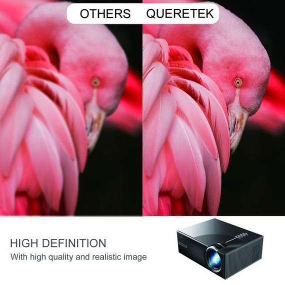 - [Lower noise & Longer lamp life]: Queretek projectors are equipped with a leading cooling system with awesome heat dispersion, which cut 50% noise. The LED lamp life was extended to 50,000 hours. It will provide you with more quieter and comfortable home theater environment when enjoy your Family Prime Time.