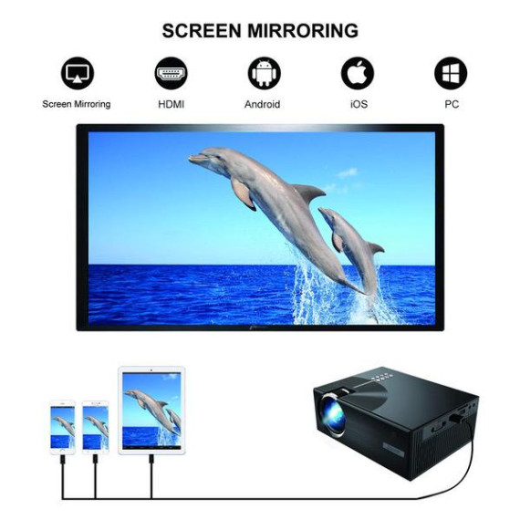- [Screen Mirroring Connection Technology]: NO longer need any Dongle, HDMI Adapter or WiFi ! This Queretek projector can smoothly transmit the data of smart phones to big screen for projection display through Screen Mirroring by USB Cable directly.