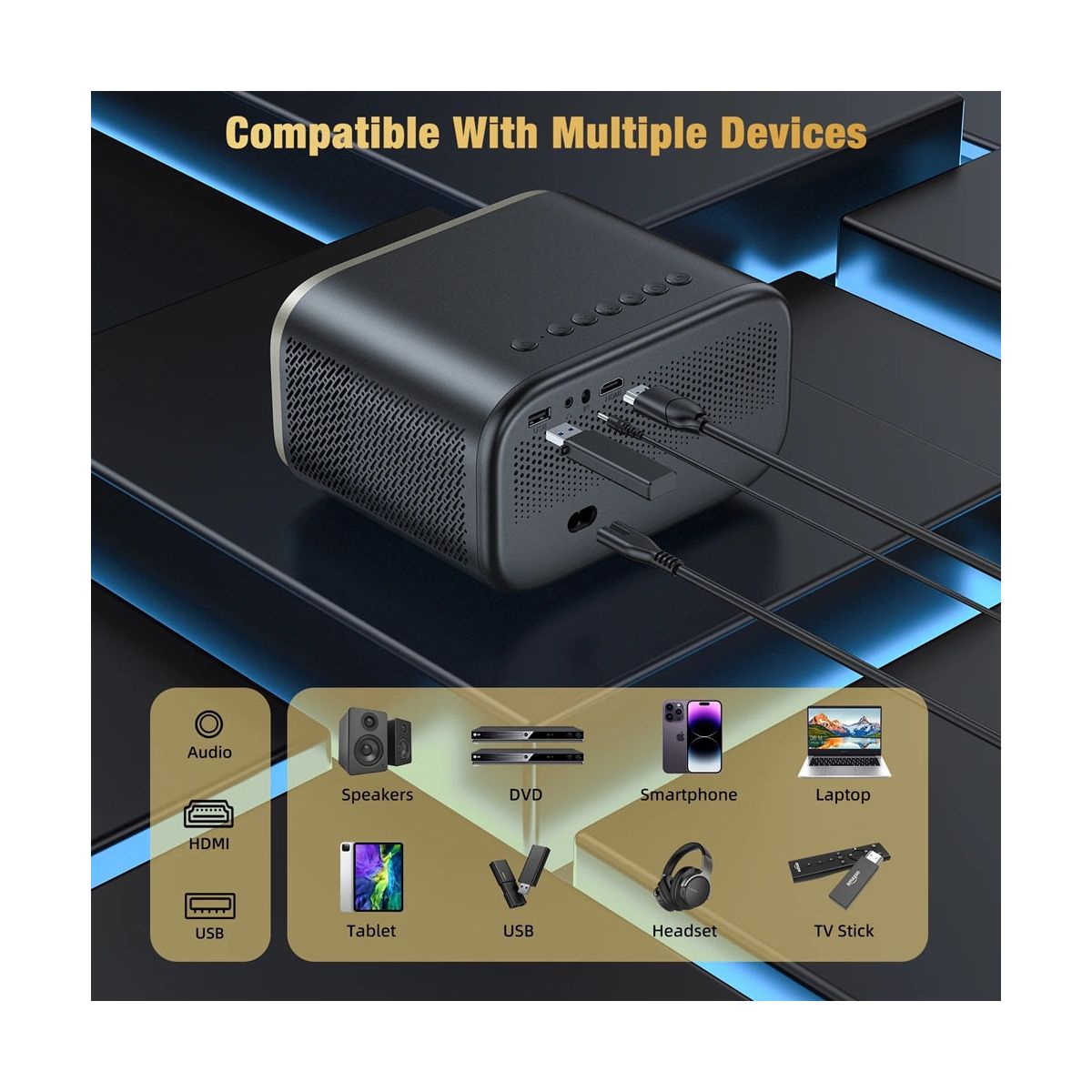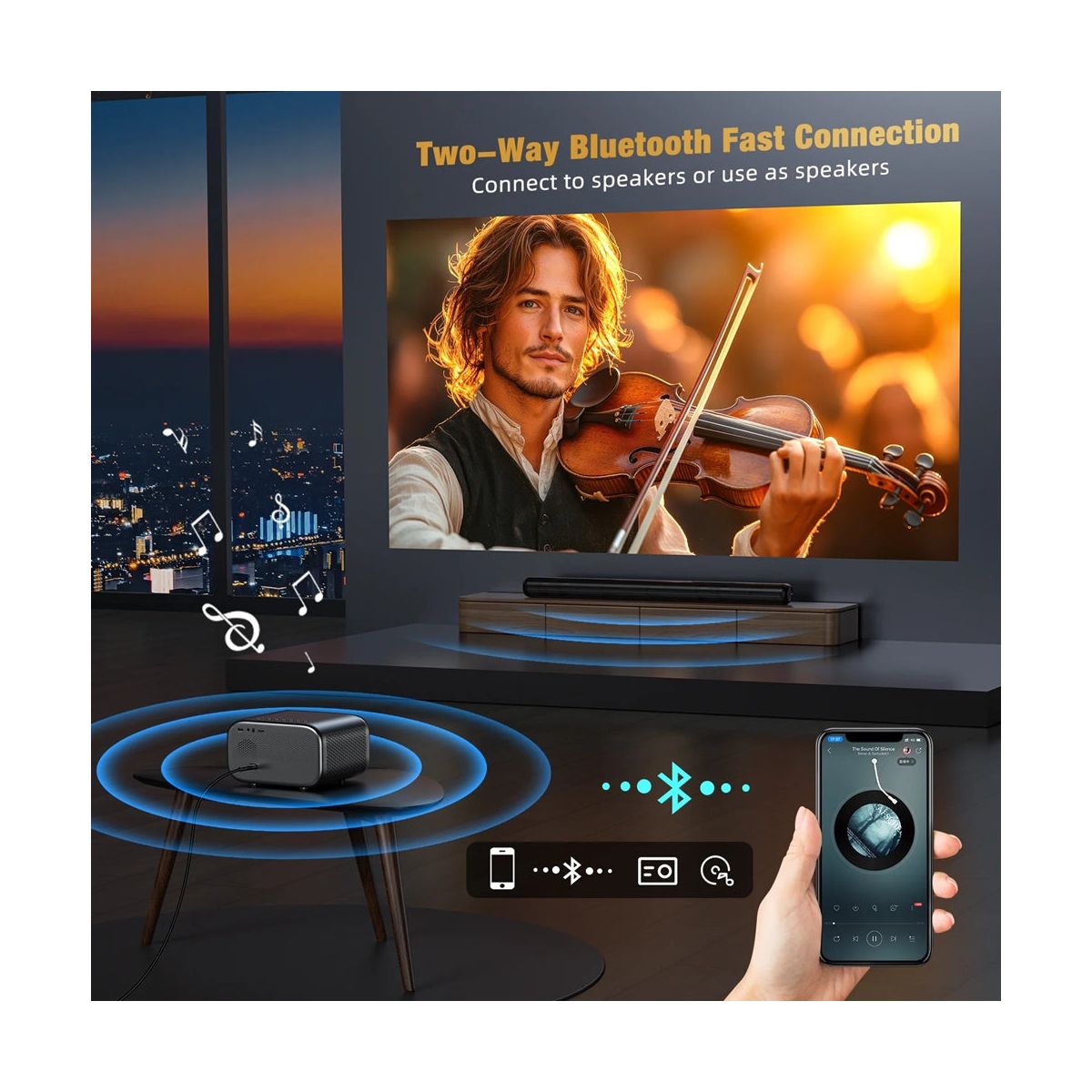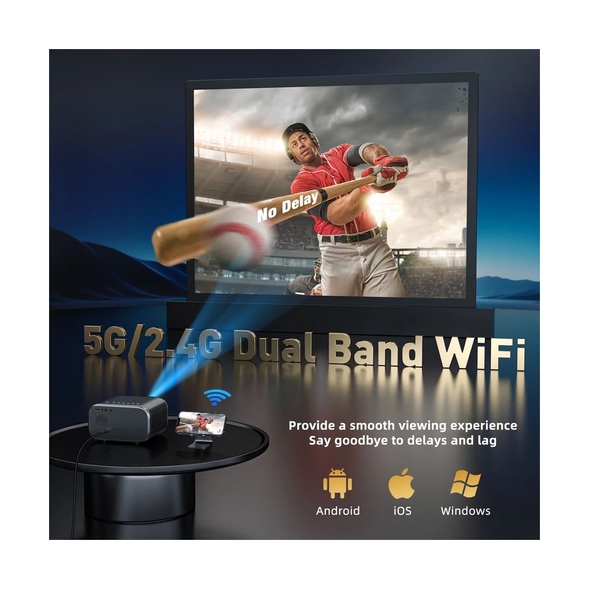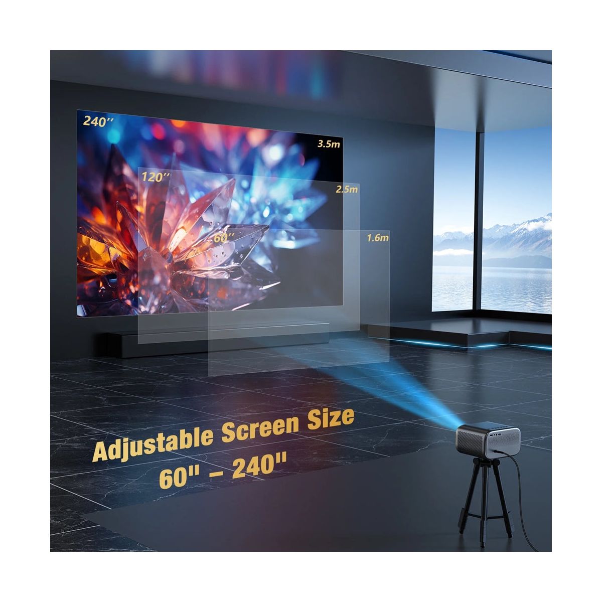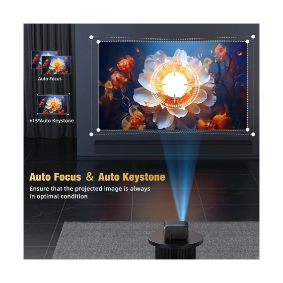 WiFi Projector with Bluetooth 5.0 for Wireless Freedom Enjoy smooth screen mirroring via dual-band 2.4G/5G WiFi and immersive sound with two-way Bluetooth 5.0. Easily connect your smartphone or tablet wirelessly and pair with Bluetooth speakers or headphones for a cable-free experience. Portable Projector with 60–240” Display Range Project images from 5.25 to 11.5 feet away, scaling up to 240 inches—ideal for living rooms, outdoor gatherings, or camping trips. ±15° 4D keystone correction and 1-second autofocus ensure a clear, aligned picture on any surface. Compact & Travel-Ready with Long LED Lifespan Weighing only 3.3 lbs and measuring just 6.5×5.1×3.8 inches, this portable projector is easy to carry and tripod-ready for flexible placement. The LED lamp lasts up to 50,000 hours, making it perfect for long-term use with minimal maintenance. Universal Compatibility & Plug-and-Play Convenience With HDMI 2.0 (ARC), USB, AV, and 3.5mm ports, this home theater projector connects easily to Fire TV Stick, Roku, PS5, Xbox, laptops, and more. Plug in a USB drive to directly play JPEG, MP4, or AVI files—no apps or WiFi required.