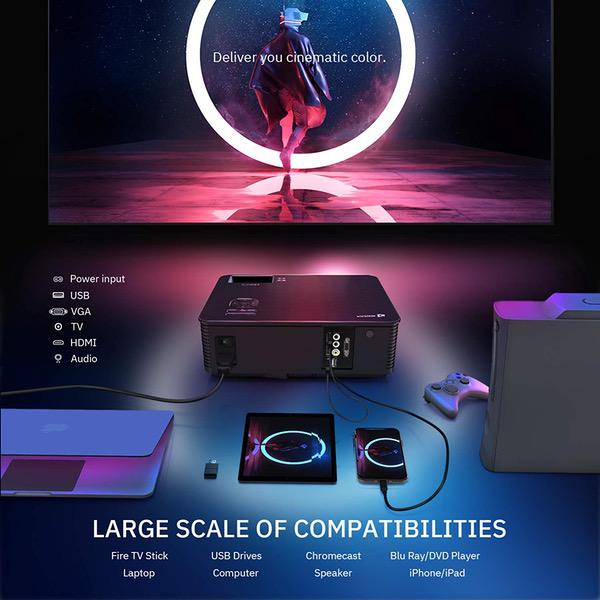 • 【Large Scale of Compatibilities】The projector compatible with the latest multimedia devices including but not limited to: smartphones, tablets, laptops, Amazon Fire TV stick, and PS4.