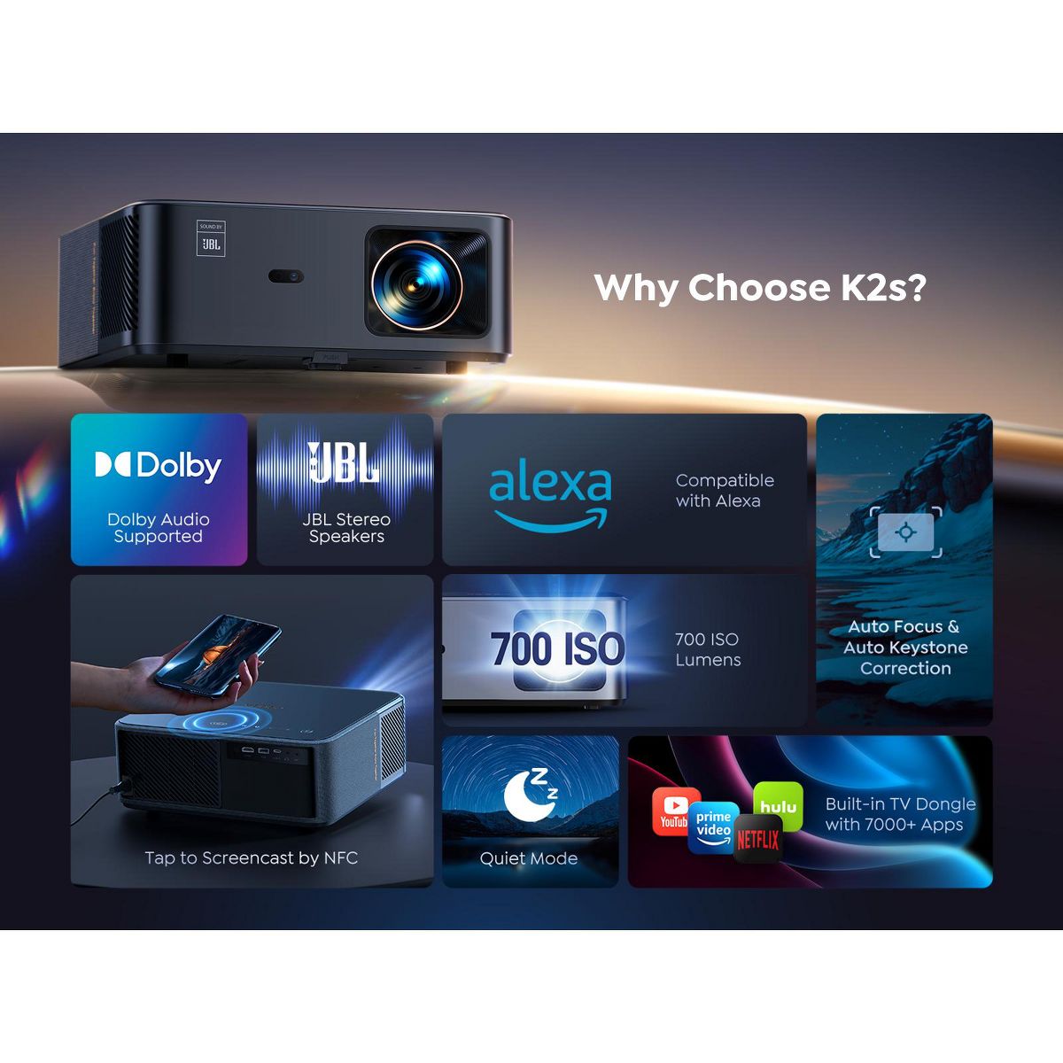 The Yaber K2s is a smart home theater projector designed to deliver an immersive viewing experience with advanced features and high-quality performance. It offers a native 1080p resolution and supports 4K content, ensuring sharp and detailed images.700 ISO lumens, making it suitable for various lighting conditions, though optimal performance is achieved in dimly lit environments.Equipped with dual 10W JBL stereo speakers and Dolby Audio support, the K2s provides dynamic and immersive sound, enhancing movie nights, gaming sessions, and presentations. The projector includes a built-in TV dongle running Android TV, granting access to over 7,000 apps