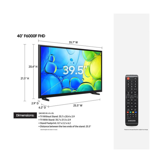Elevate your everyday entertainment with the Samsung 40" F6000F Full HD Smart TV (2025). Designed for crisp clarity, vibrant color, and easy streaming, this 1080p LED TV delivers a brilliant viewing experience for movies, sports, gaming, and your favorite apps. Powered by Samsung’s intuitive Tizen Smart Platform, you can access popular streaming services in seconds and enjoy quick, fluid navigation.