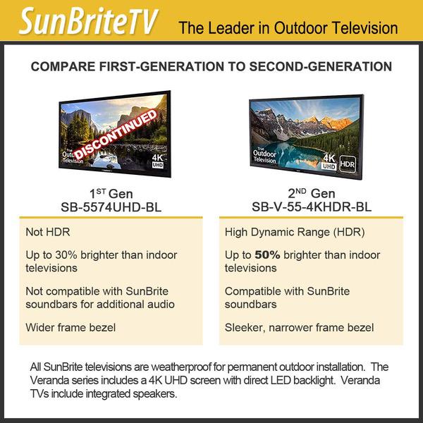 - WEATHERPROOF OUTDOOR TELEVISION - SunBriteTV 55" Veranda Series 4k UHD TV is optimal for full-shade outside living areas like a covered patio or screened gazebo.