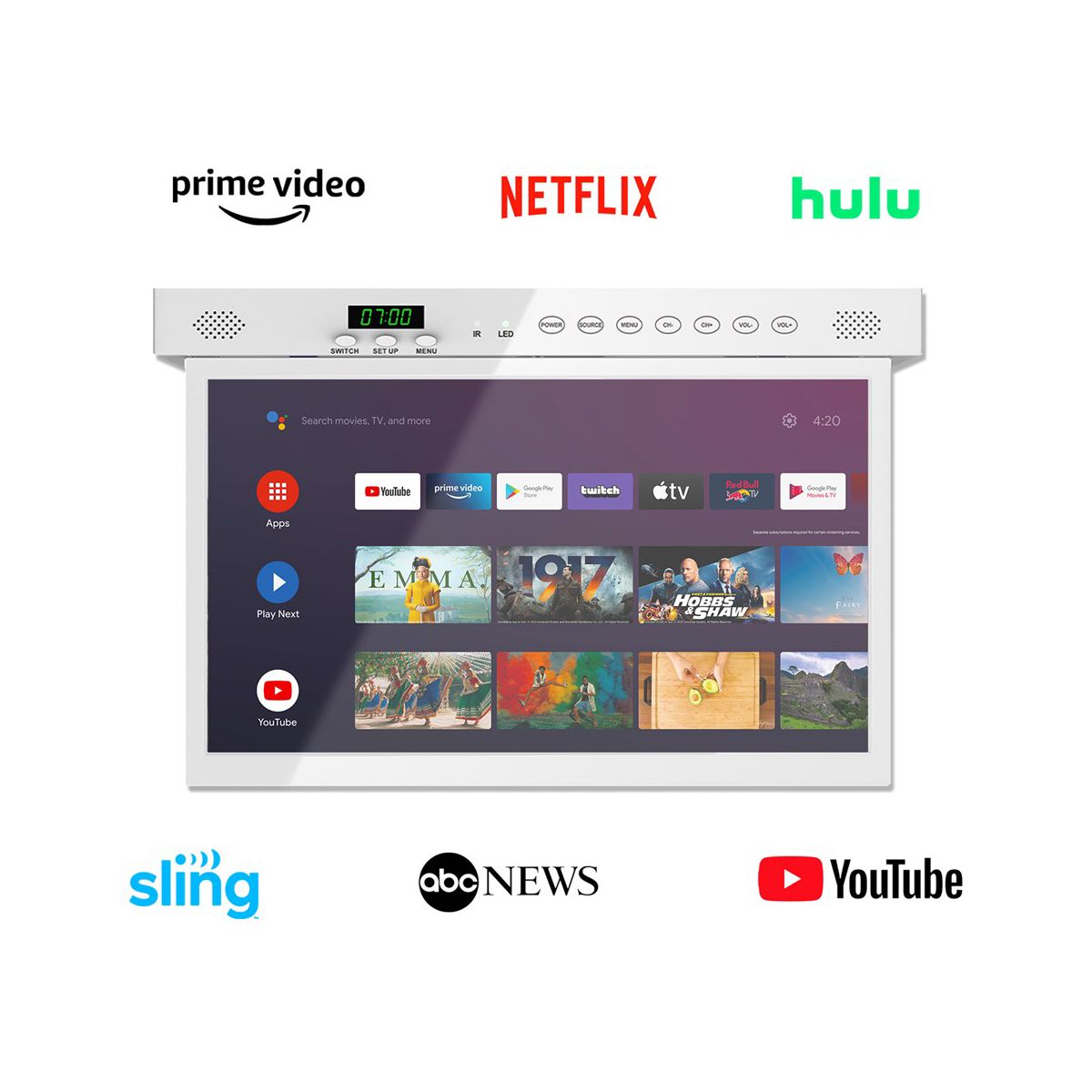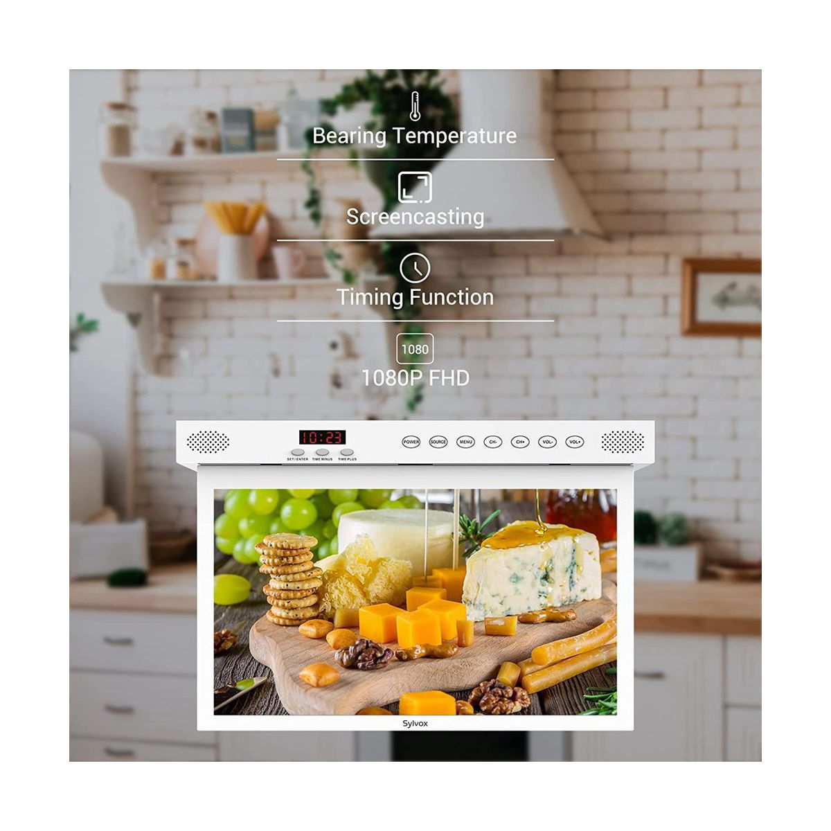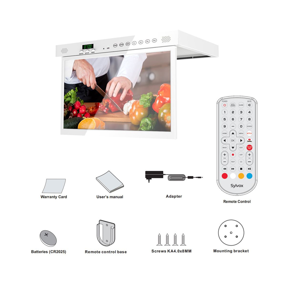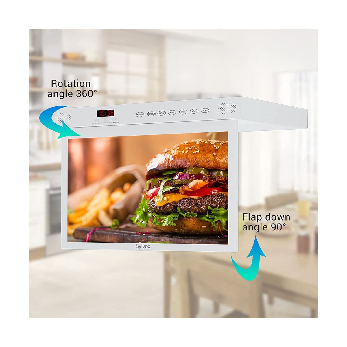 SYLVOX Small Kitchen TV Under Cabinet or Counter is designed for the kitchen, the screen can be rotated from different angles. And equipped with Android 11.0 system with 1.5G+8G memory, you can download the apps you want anytime. Built-in Bluetooth 5.0, 2.4+5G full-band WiFi, 1.5G+8G memory, 1080P, Under Cabinet kitchen TV with LED clock display, timer alarm function, kitchen TV remote control supports voice, IR, Bluetooth control function, supports HBBTV, rear interface.