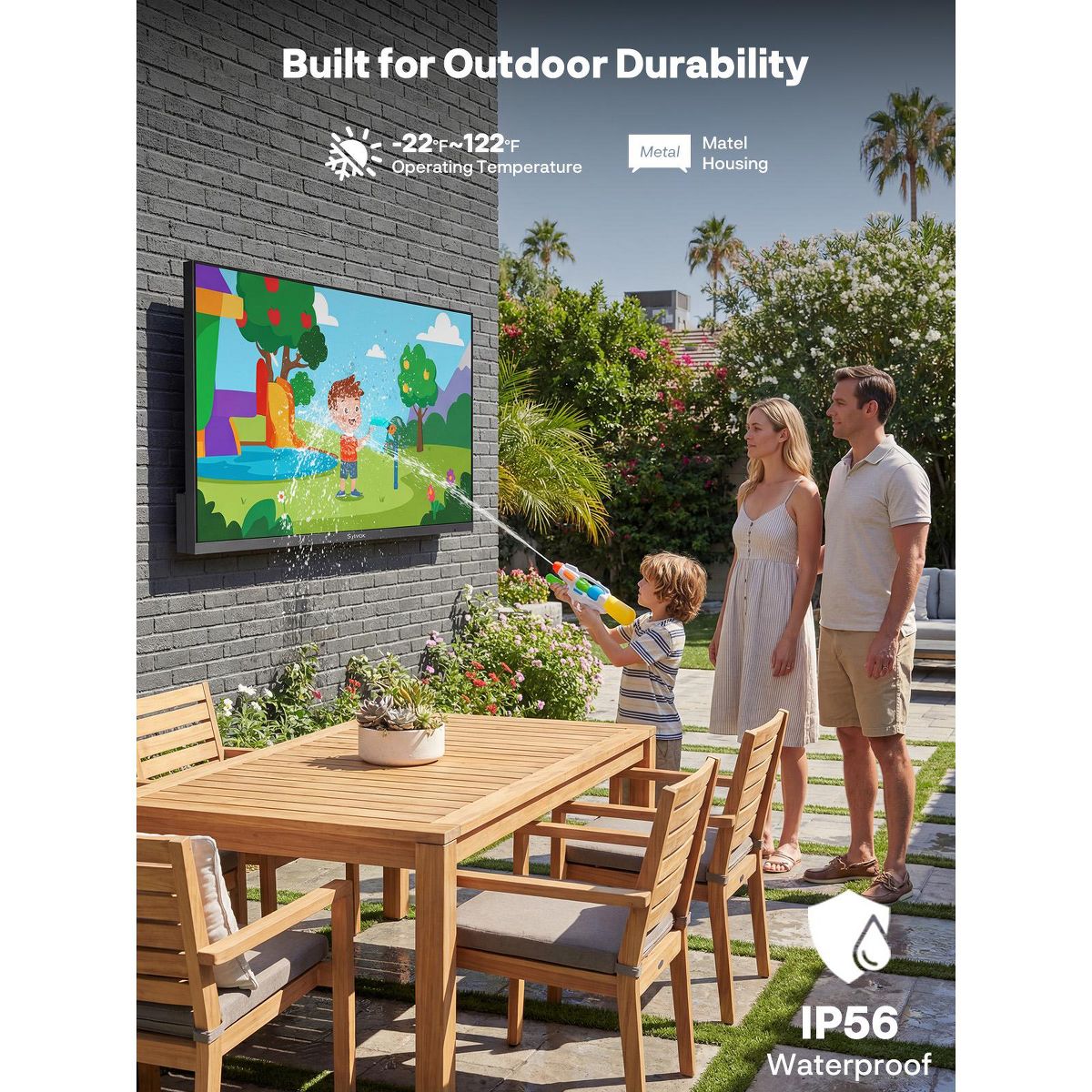 Engineered as a true weatherproof TV, it stands up to rain, humidity, dust, and extreme heat and cold. The durable housing and sealed interior deliver reliable performance year-round, making it a dependable choice for outdoor TVs placed in open or semi-covered spaces.