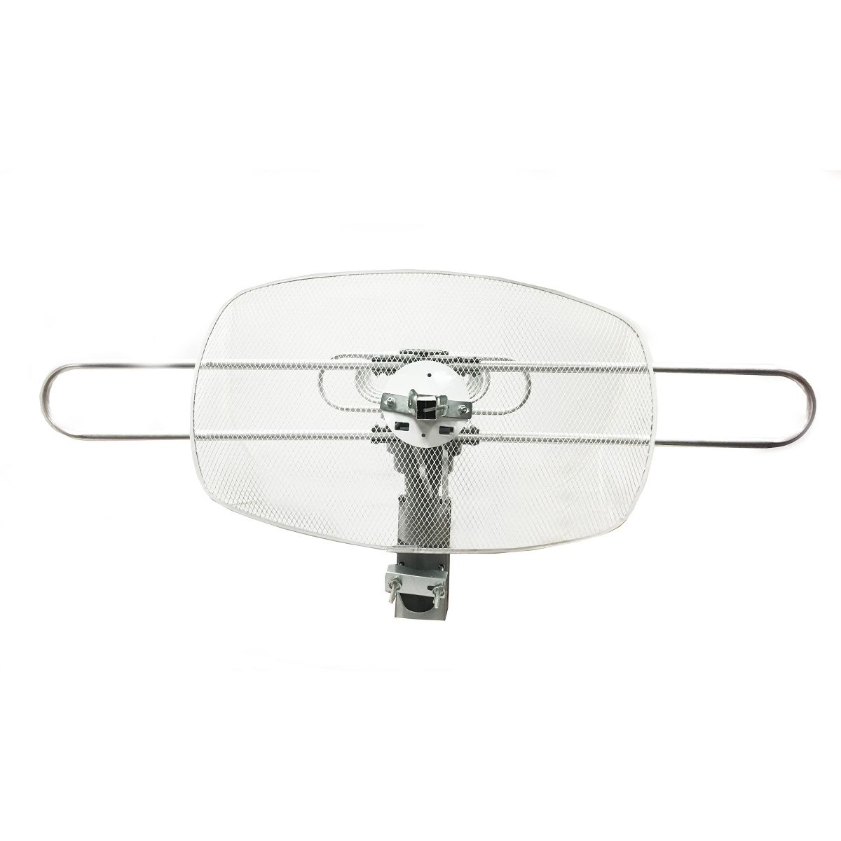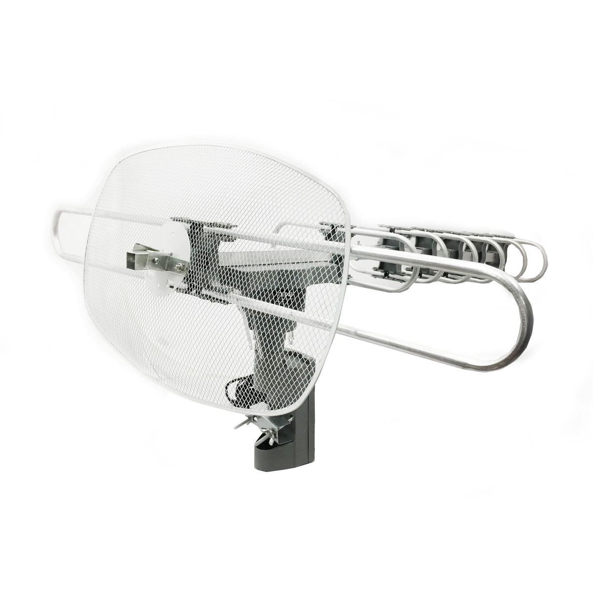 This high-powered amplified motorized outdoor at SC digital TV antenna from Naxa rotates 350 degrees to optimize the reception of any station. Rotate the antenna from the comfort of your living room with the included remote control. Its large size improves reception, picture, and sound quality while maintaining a slim and modern profile, and it’s compatible with UHF, VHF, and FM signals. A wireless remote control, easy installation bracket, coaxial cable, plastic safety ties, and cable straps are included.