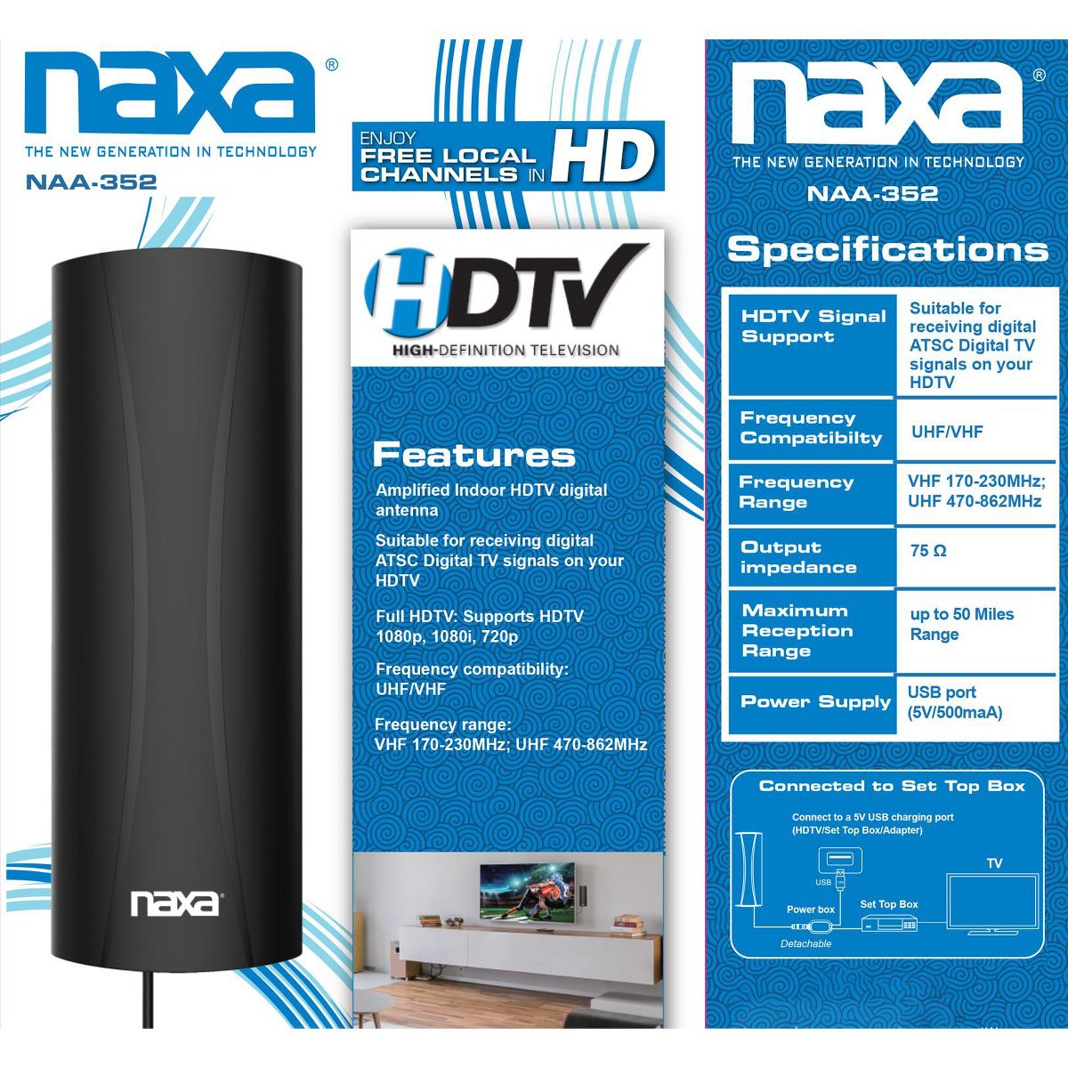 Naxa Electronics NAA-352 High Powered Digital Amplified Slim Antenna with 360-Degree Motorized Rotation Suitable for HDTV and ATSC Digital Television,