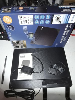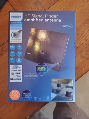 Wall-mounting hardware and a convenient tabletop stand are included for versatile setup. The brushed black finish and modern, flat-panel design coordinate seamlessly into your home theater. Focus on outstanding reception with the Philips Elite HD Signal Finder Amplified Antenna. Model #SDV3238N/27