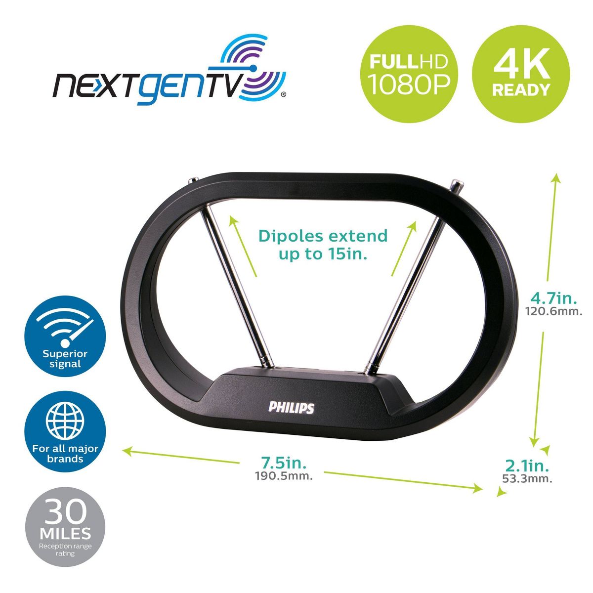 Watch what you’ve been missing with the Philips HD Loop Antenna. Ditch expensive cable and continue viewing your favorite local shows in full 1080p high definition at no cost. Enhanced reception and a perfect signal make this 4K Ultra HD-ready antenna the ideal counterpart to streaming your favorite digital content.