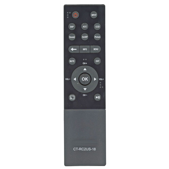 The CT-RC2US-18 is a remote control specifically engineered for Insignia televisions with Chromecast built-in functionality. This remote delivers intuitive access to streaming apps, and traditional TV controls through a unified interface.  Supplied with models: 50L711U18, 43L511U18, 50L711U18, 55L711U18