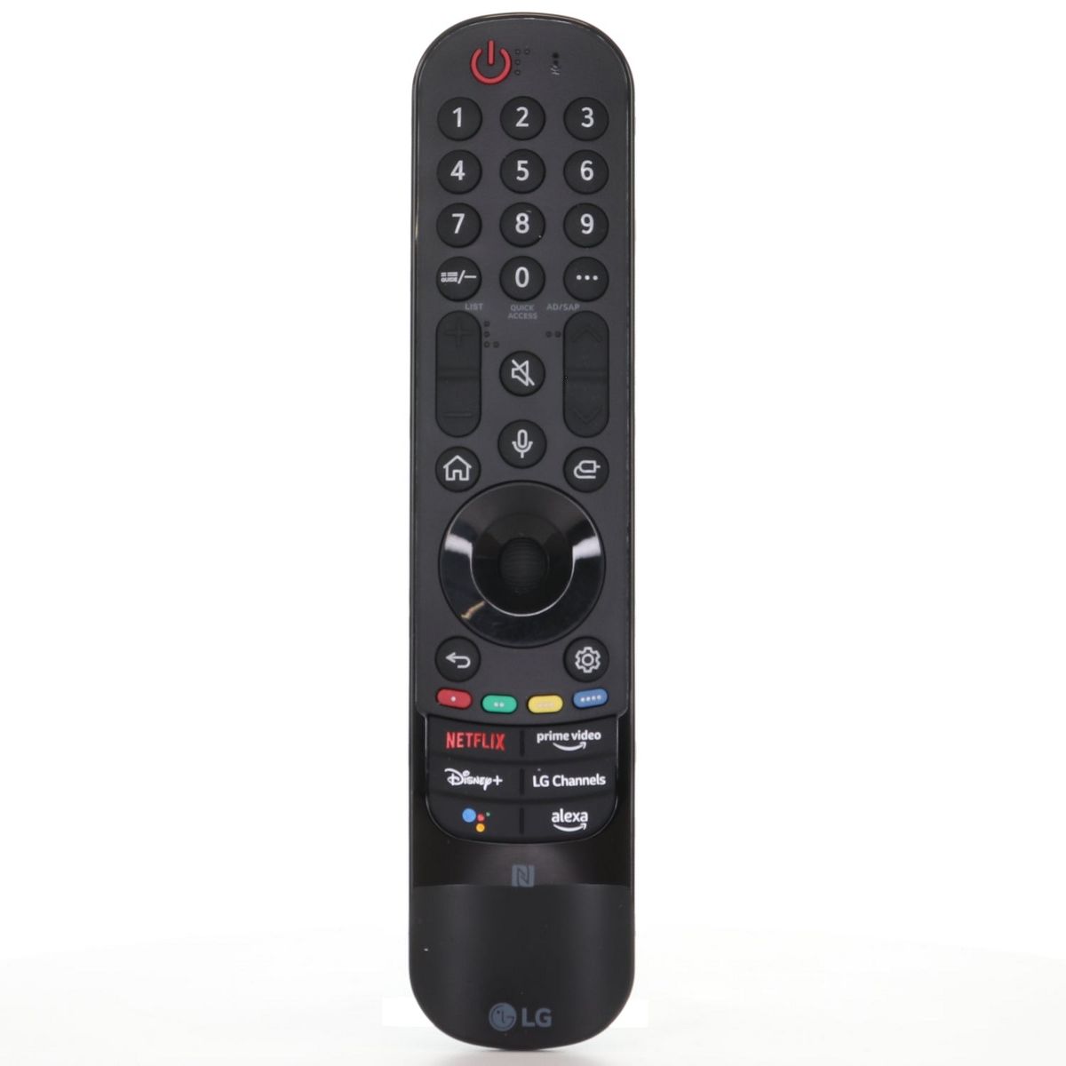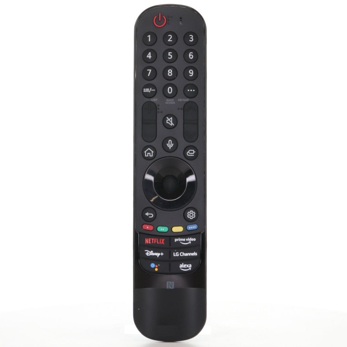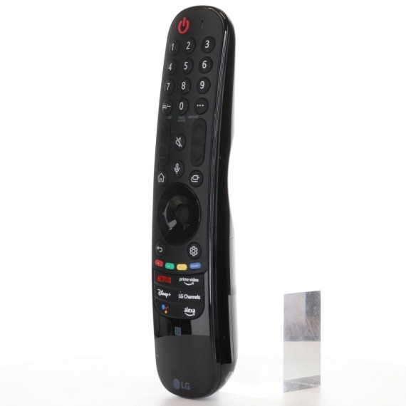 The MR22GN Magic Remote is the original smart remote for 2022–2023 LG TVs, featuring NFC pairing, voice control with Google Assistant & Alexa, and motion-based navigation. It also includes dedicated shortcut buttons for Netflix, Prime Video, Disney+, and LG Channels