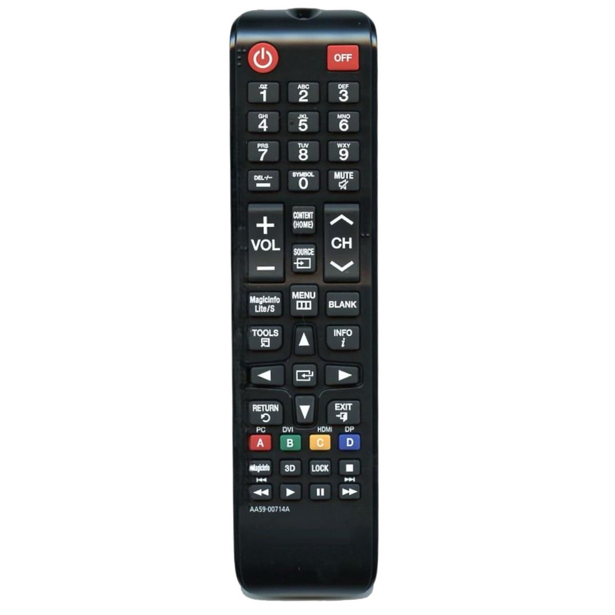 The AA59-00714A remote control is engineered for precise and reliable operation of compatible Samsung monitor display TVs. Its intuitive button layout ensures effortless access to essential functions, delivering a seamless user experience. Built to Samsung's exacting standards, this remote offers durable performance and optimal compatibility, making it a dependable replacement or spare for maintaining full control of your Samsung display.