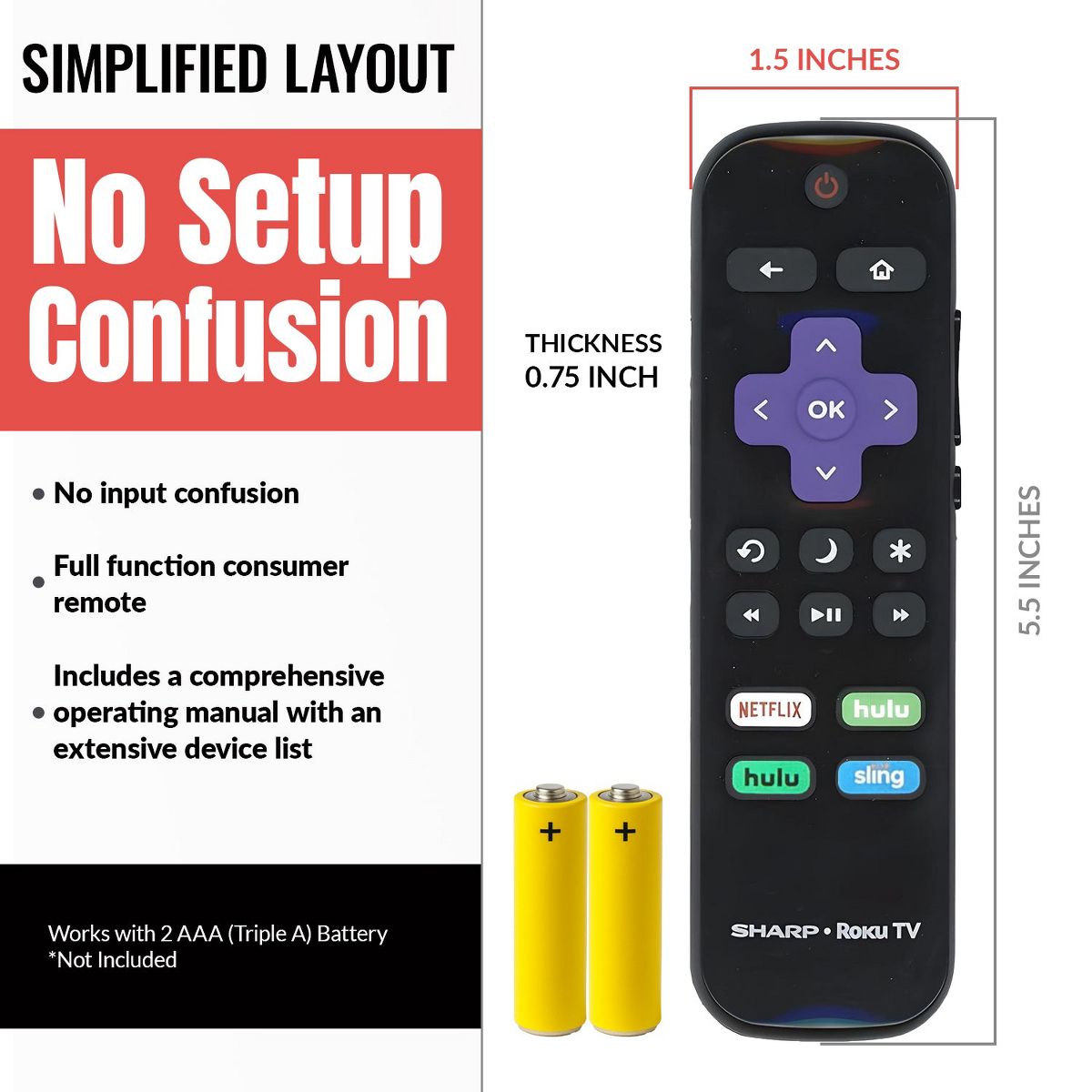 The LC-RCRUDUS-20 Roku TV remote control is designed specifically for 2018 and 2019 models, offering seamless navigation and direct access to popular streaming services like Netflix, Hulu, Sling, and AT&T Now. Its user-friendly layout enhances your viewing experience by simplifying control functions and reducing the need for multiple remotes, ensuring reliable performance for effortless entertainment management.