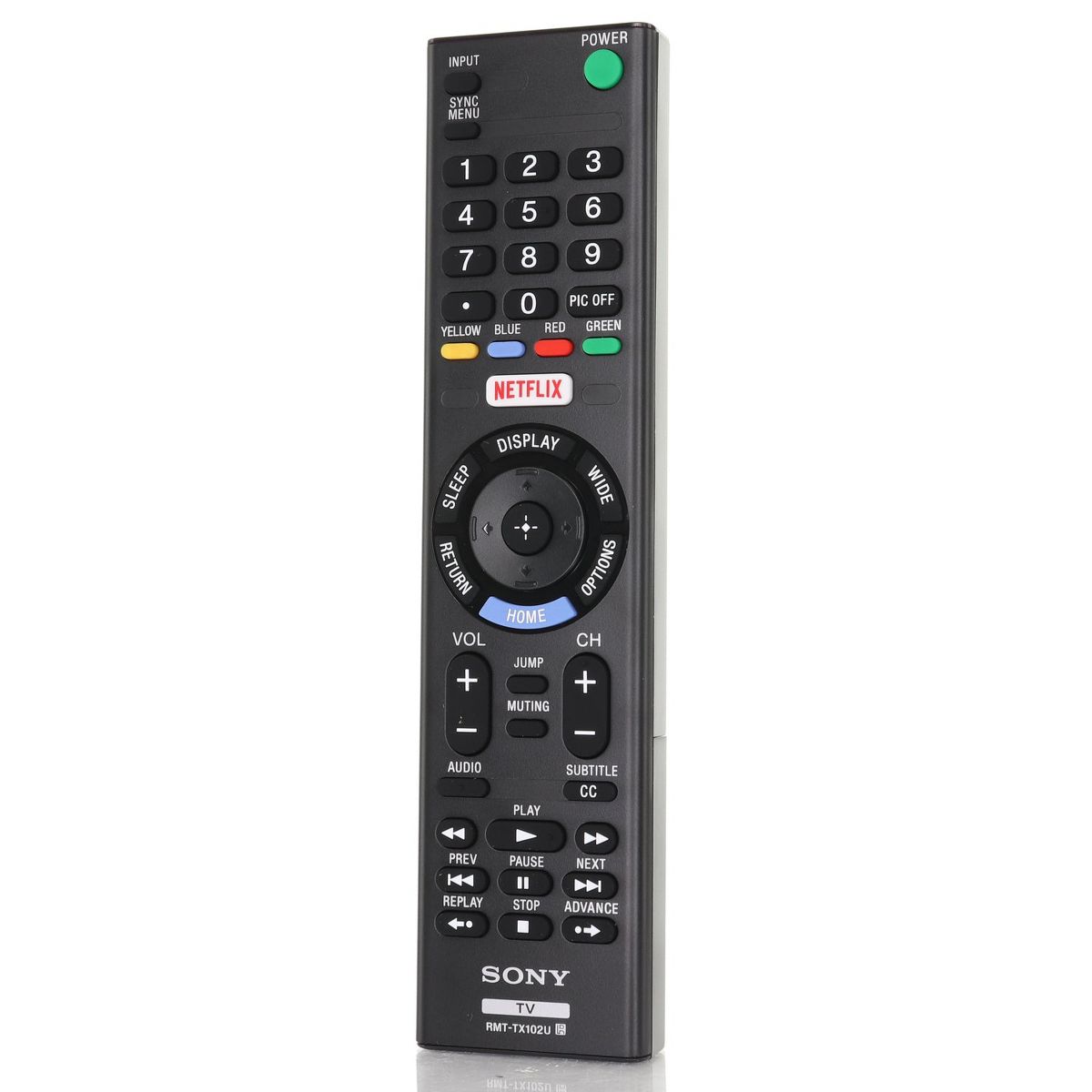 The RMT-TX102U remote control is designed for select Sony Smart TVs and features a dedicated Netflix button for quick access. This IR-only remote provides reliable control of compatible Sony models without requiring programming.