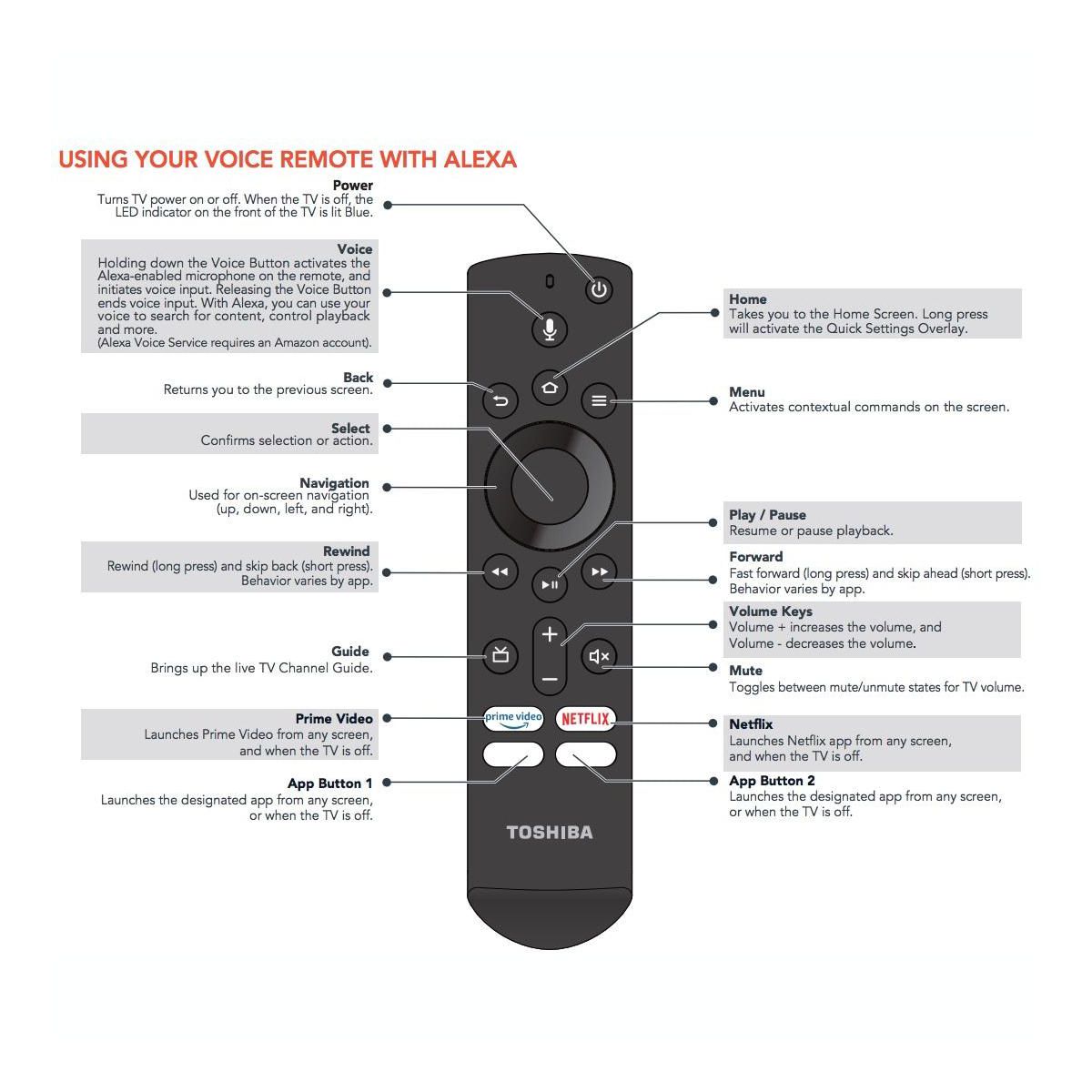 The Toshiba CT-RC1US-19 Fire Edition TV Remote Control is a reliable replacement for Toshiba Fire TVs, offering full voice functionality and dedicated app shortcuts for Prime Video, Netflix, HBO, and VUE. Designed for seamless integration, this remote works with many Toshiba Fire TV models, ensuring you can continue navigating your favorite content effortlessly. It comes pre-configured and ready to pair with your television using a simple HOME button setup, restoring all original functions including power, volume, and menu navigation.