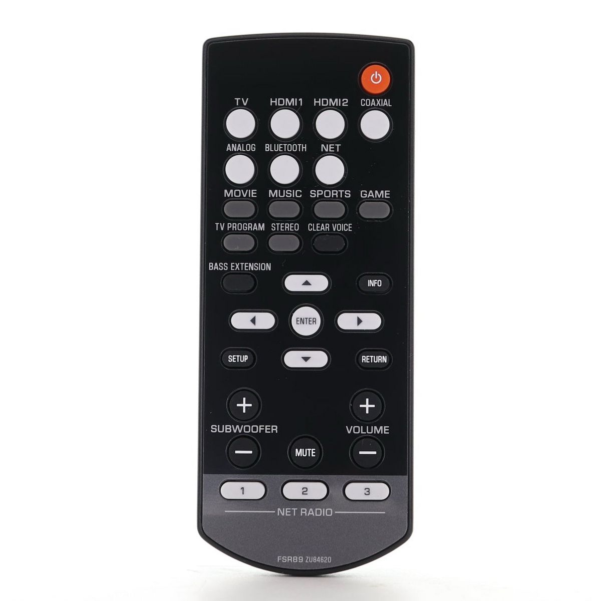 The FSR89 remote control is an original infrared controller designed for select Yamaha MusicCast sound bars and subwoofers. It provides full control over sound modes, input selection, and volume for your wireless multiroom audio setup. No programming is required for compatible models.