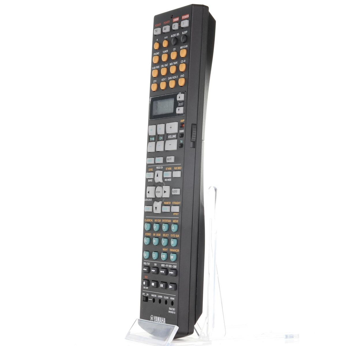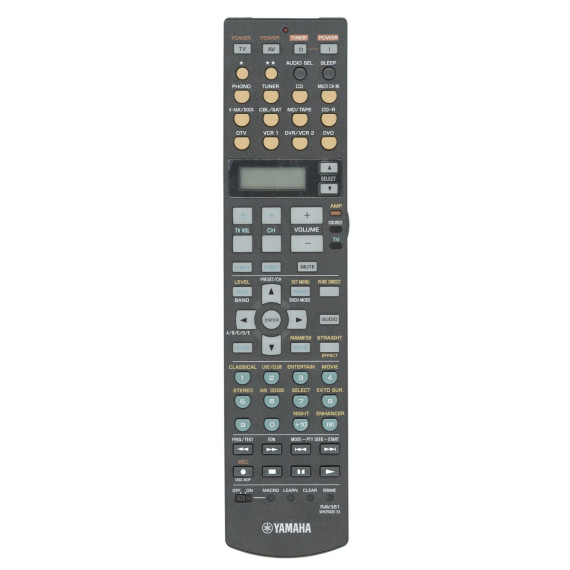 The Yamaha RAV361 (WH25420EX) remote control is designed for use with select Yamaha A/V receivers. It features an LCD display for easy navigation of advanced functions and supports full control of receiver inputs, sound modes, and playback devices. No programming is required when used with compatible Yamaha models.