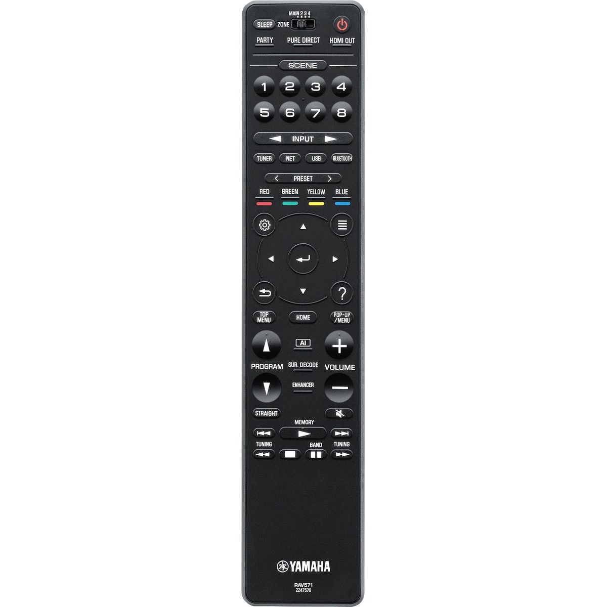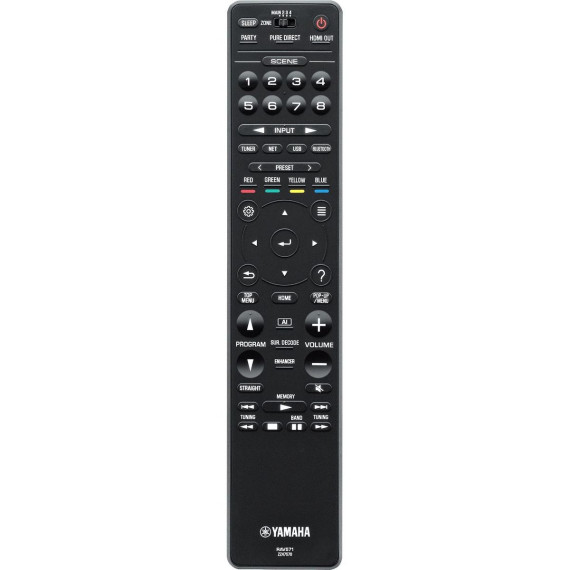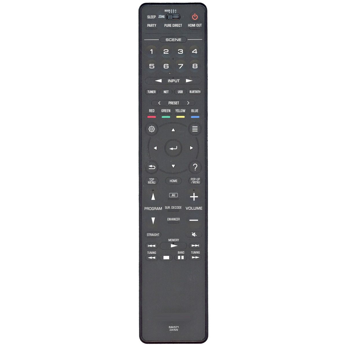 The RAV571 remote control is designed for select Yamaha A/V receiver systems, featuring intuitive layout and touch-sensitive backlighting for low-light operation. This genuine Yamaha remote provides full control over audio, input selection, and surround settings without requiring programming.