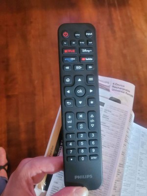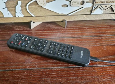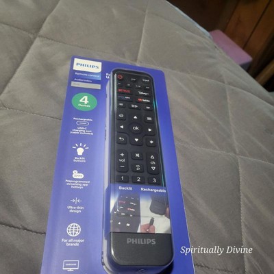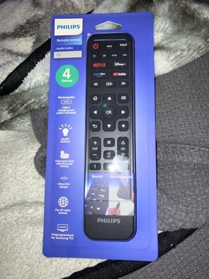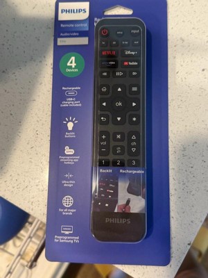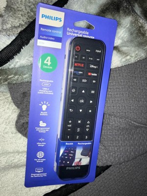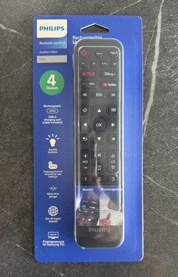 Relax, recharge and take control of your entertainment with the innovative Philips Elite Rechargeable Universal Remote. This slim, 4-device remote features an integrated rechargeable battery that stays powered for months on a single charge — no more replacing worn-out batteries. Simply connect the remote control to a power source using the included 18in. USB-C to USB-A cable. The charging indicator light glows blue during charging and green when fully charged. Additionally, the remote is safe to use while charging. Designed to control up to four devices, including your TV, Blu-ray/DVD player, streaming media player, soundbar and more, this universal remote control features app hotkeys programmed for direct access to popular streaming apps: Netflix, Disney+, Prime Video and YouTube. The TV and STR (streaming) device buttons come preprogrammed for Samsung TVs and Roku streaming boxes, and all device buttons can easily be programmed for use with thousands of other devices using automatic code search or direct code entry programming. For added convenience, this remote offers full backlighting as well as simple menu navigation and a dot button for direct sub-channel access. The Philips Elite Rechargeable Universal Remote is your ticket to great entertainment.