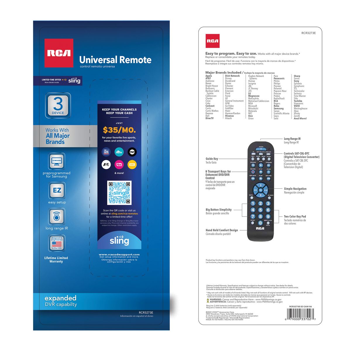 This RCA 3-Device Universal Remote can control up to 3 components and works with over 350 brands. It comes with a broad DVD and DVR functionality for satellite or cable or digital converter box, including skip back, skip forward and slow play keys. It comes in black with a contemporary thin design, sure to please every customer!