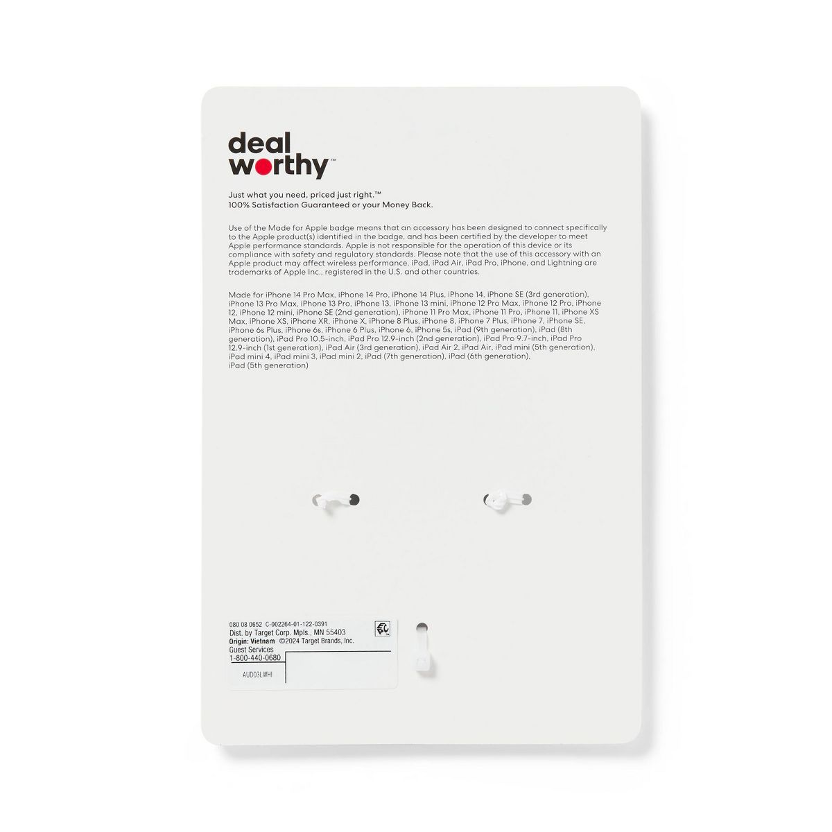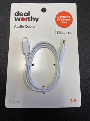 Experience clear audio and hassle free connectivity with the 3' Lightning to Aux Cable - dealworthy™ White. This cable features a 3.5mm jack at one end and a Lightning connector at the other that's compatible with iPhone 14 and older models and select iPads. With a warranty lasting for one year, you can rely on this 3-foot cable for high-quality audio connections, whether you're listening to music or making calls.