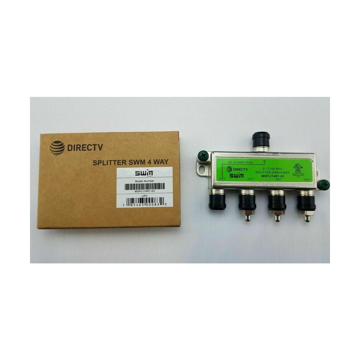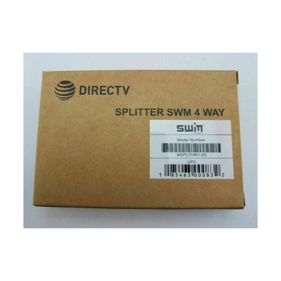 Brand New DIRECTV Approved SWM MRV 4-Way Wide Band Splitter MSPLIT4R1-03 Green This 2-2150 MHz four-way splitter is used to split a single line from a SWM Switch or LNB to four lines to feed four receivers. Indoor/outdoor SWM splitter features one input and four outputs, one of which passes DC power, which is labeled in red. This high isolation wideband splitter is compatible with all SWM and MRV installations. This green label DIRECTV-approved splitter for multi-room viewing is the splitter to use for DIRECTV whole-home service. Key features* DIRECTV approved for whole-home viewing used with SWM installations* 500mA DC passing from one port only* High isolation between outputs* Diode steered protection* Only recommended for DIRECTV SWM systems* Manufacturers may vary