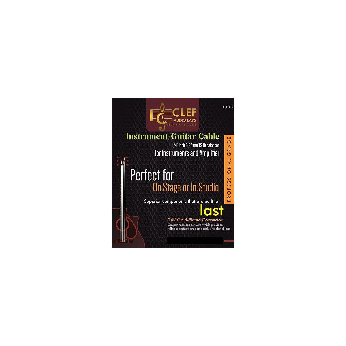 Deliver breathtaking guitar solos and professional performances with a guitar cable designed to deliver unmatched audio quality. If you’re a guitar player you know that beyond your instrument the right accessories can make all the difference in how you sound when you’re playing. And if you’re hooked up to a speaker amp you want to ensure it’s a clean, stable connection that lets you pump out those rifts like Hendrix himself. Clef Audio Labs Premium Guitar Cables were specifically developed to provide a higher-quality sound because they feature long, shield cabling, gold-plated plugs, and a convenient connection that all work together to eliminate noise and let your sound shine through. They’re also long, flexible, and provide plenty of room for you to move around the stage or show off your guitar solos, so you can always produce clear and consistent sound that you and your fans want to hear. Perfect for beginners and professionals alike make sure you’re always prepared to deliver a show you can be proud of; choose Clef Audio Labs guitar cables and let your crisp sound speak for itself. Product Details: Professional Guitar Cable Shielded Protection for Enhanced Audio Insulated Solder Joints Gold-Plated Plug Tips Compatible with Bass, Acoustic, or Electric Guitars Let your play speak for itself by choosing a guitar cable that offers superior sound quality and gives you the freedom to move and express your every note with style.
