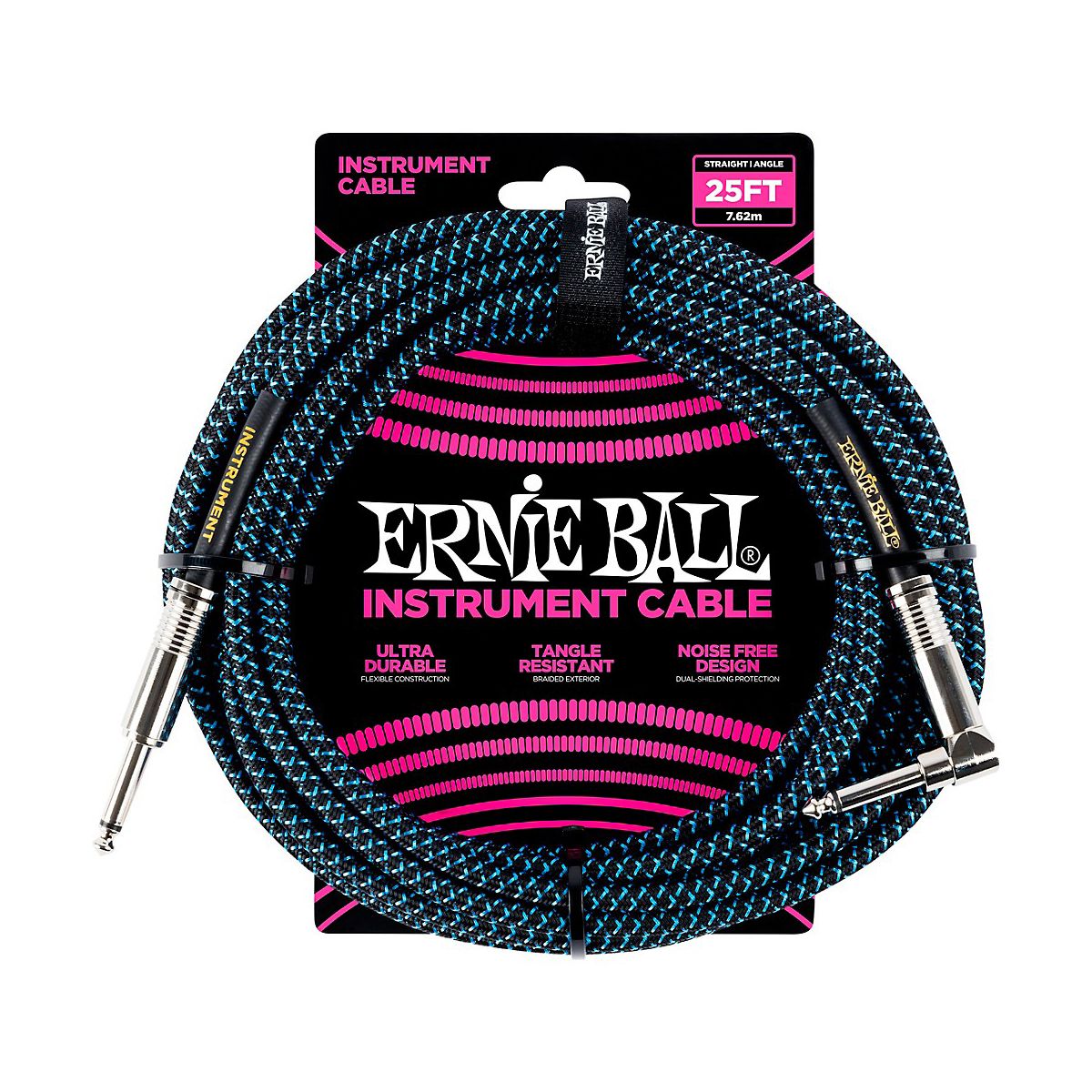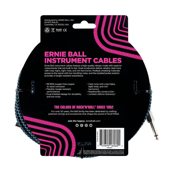 Ernie Ball instrument cables feature a high-quality design made with superior components that are built to last. Dual-conductors deliver reliably clear tone with crisp highs, tight mids, and rich harmonics. Multiple shielding materials preserve the signal with low handling noise, and the braided jacket exterior provides a tangle-resistant experience.