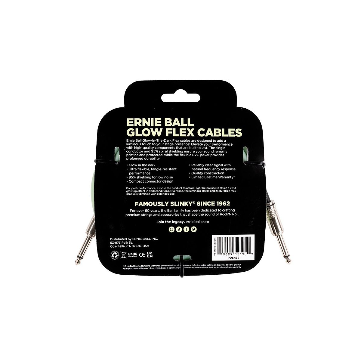 The Ernie Ball Glow-in-the-Dark flex cable provides luminous style and reliable performance. can elevate playing experience with its glow-in-the-dark PVC jacket and high-quality components built to last. The single-conductor design delivers crystal-clear tone and extra flex for easy coiling, while 95% shielding rejects noise and preserves signal. The durable PVC jacket ensures lasting quality gig after gig. Whether practicing at home or performing on stage, the Ernie Ball Glow-in-the-Dark Flex cable adds visual flair and dependable functionality to setup.