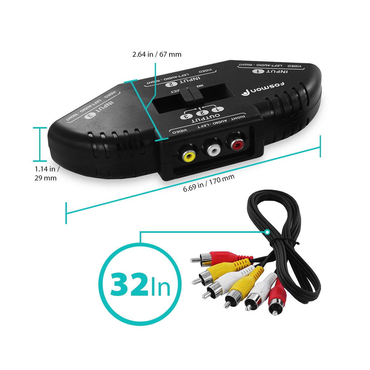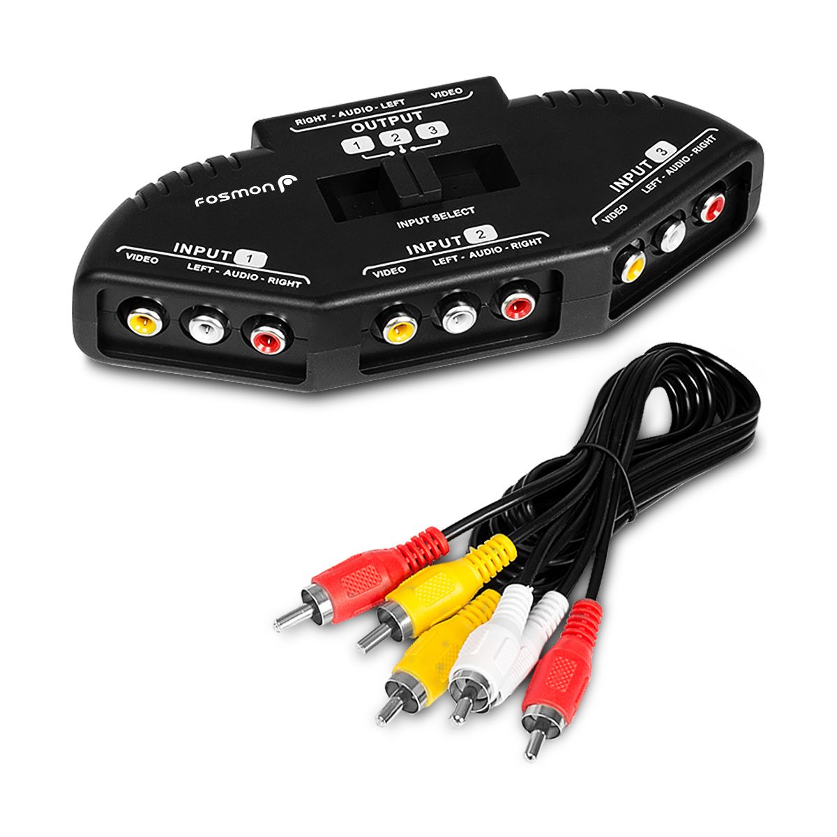 Fosmon 3-Way Composite AV Audio Video RCA Splitter + Male to Male RCA Audio Cable, 3 in 1 Out RCA Switcher Box for TV, XBOX, DVD, PS2, Wii