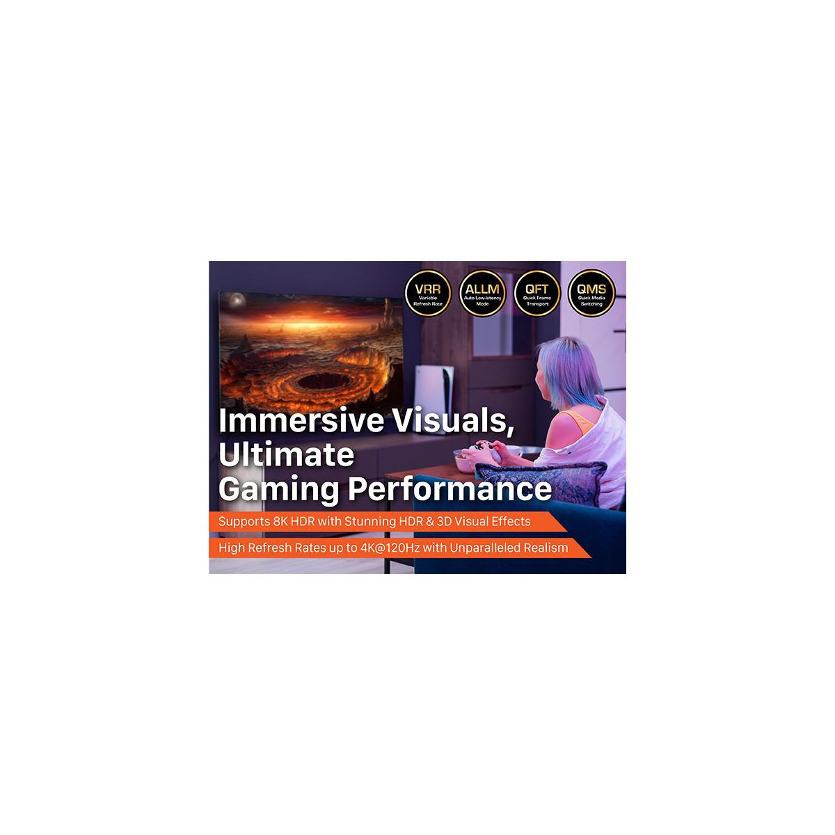 Elevate your entertainment with stunning 8K ultra-high-definition quality. Supports VRR, ALLM, QFT, QMS, Dynamic HDR Chroma 4:2:0/4:2:2/4:4:4, Dolby Vision, HDR10+ and HDCP 2.3 ensures seamless compatibility with various devices, enhancing your viewing and gaming experience with lifelike visuals and clarity.
