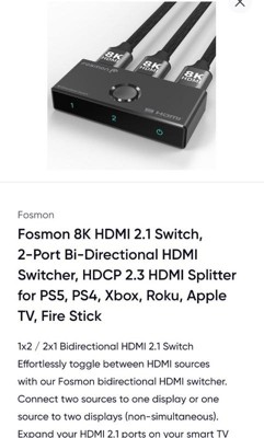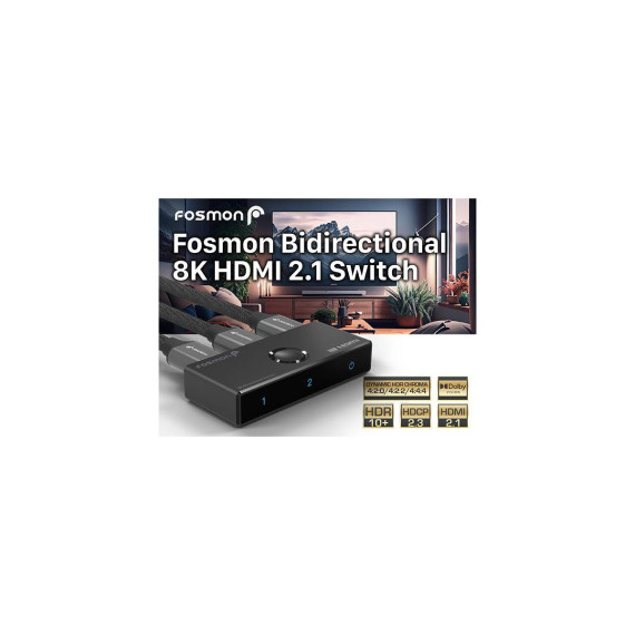 Fosmon 8K HDMI 2.1 Switch, 2-Port Bi-Directional HDMI Switcher, HDCP 2.3 HDMI Splitter for PS5, PS4, Xbox, Roku, Apple TV, Fire Stick