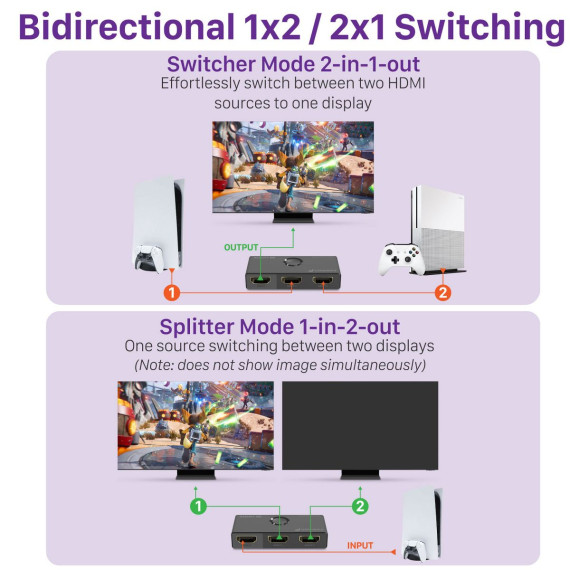 Effortlessly toggle between HDMI sources with our Fosmon bidirectional HDMI switcher. Connect two sources to one display or one source to two displays (non-simultaneous). Expand your HDMI 2.1 ports on your smart TV or monitor. Instantly switch between different sources with a simple click of a button with no quality loss or delay. There are two modes: 2-in-1-out or 1-in-2-out for flexible signal routing with no cable hassle.