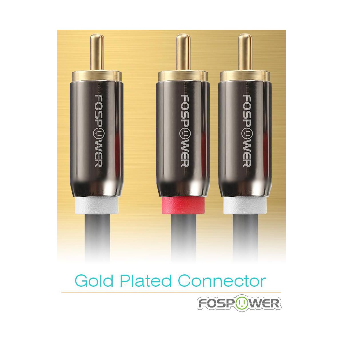 FosPower premium stereo audio cables are made from high quality 24k gold-plated connectors that resist corrosion and reduce tarnish to ensure the highest quality audio connection. Color coded connectors to distinguish polarities.