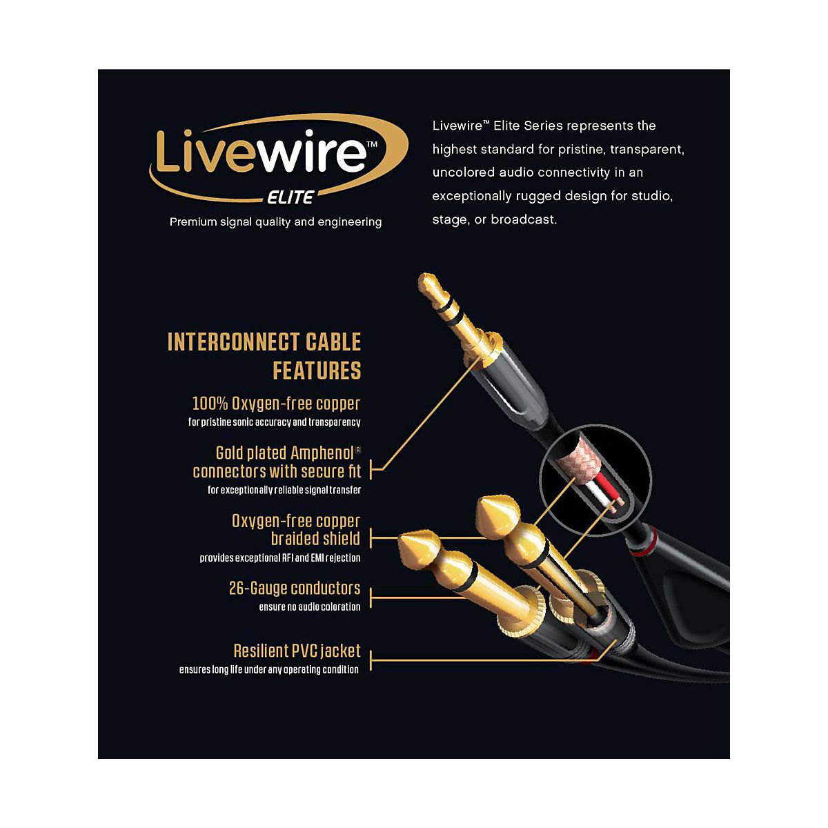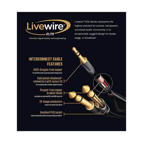 Stereo 3.5 mm TRS male to stereo 3.5 mm TRS male. Gold-plated Amphenol connectors with 100% oxygen-free copper, 26-gauge conductors, braided copper shielding and a resilient PVC jacket. Livewire Elite Series represents the highest standard for pristine, transparent, uncolored audio connectivity in an exceptionally rugged design for studio, stage or broadcast.Gold-Plated Amphenol Connectors100% Oxygen Free Copper26g Conductors With Braided Copper ShieldGuaranteed For Life