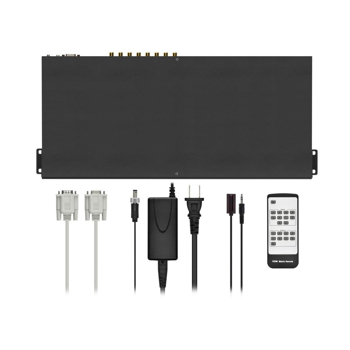 • 1x 18Gbps 8 x 8 HDMI Matrix • 1x 12V/5A Power Adapter • 1x IR Remote • 1x IR Receiver cable (1.5 meters) • 1x RS‑232 serial cable (1.5 meters, male to female head) • 2x Mounting Ear • 1x User Manual