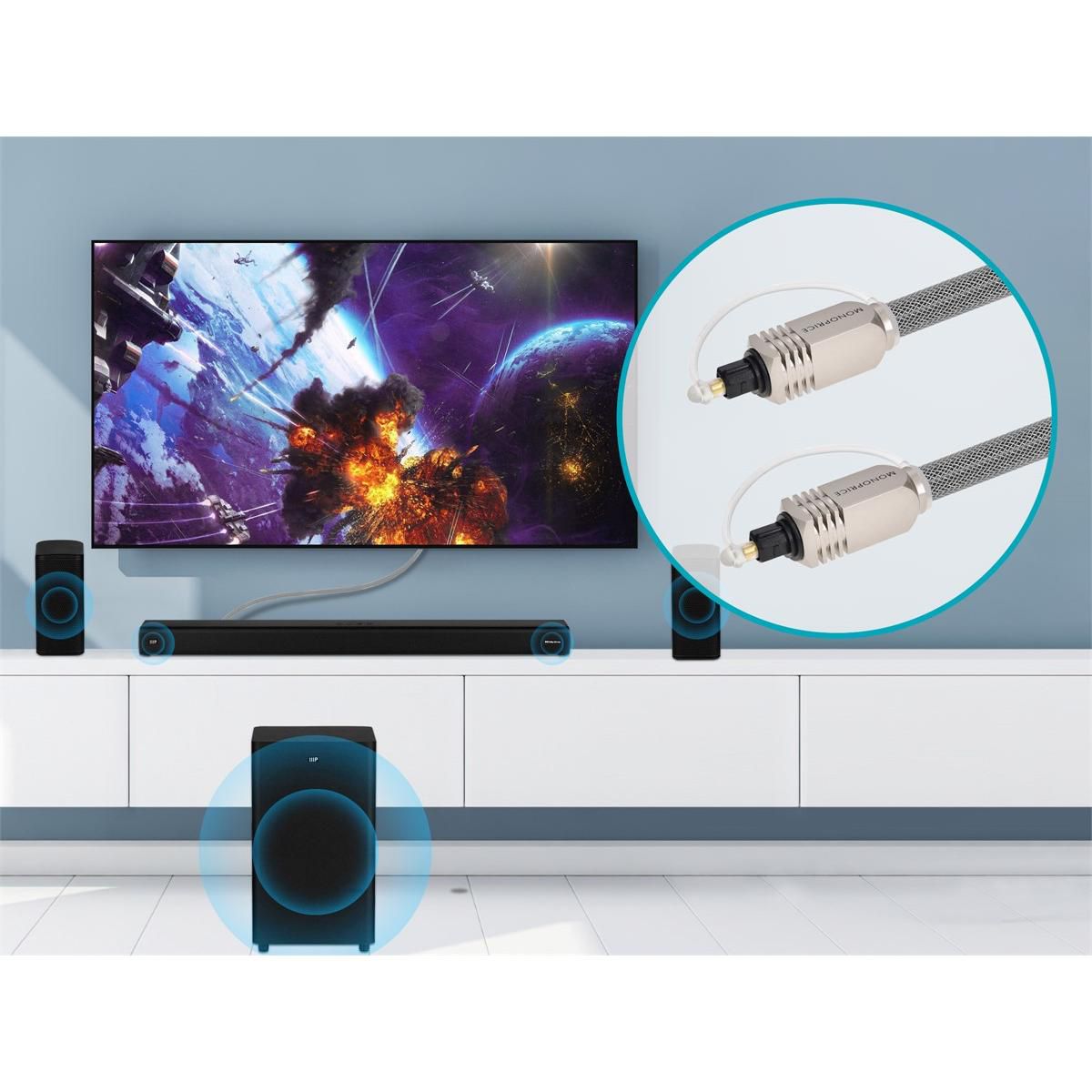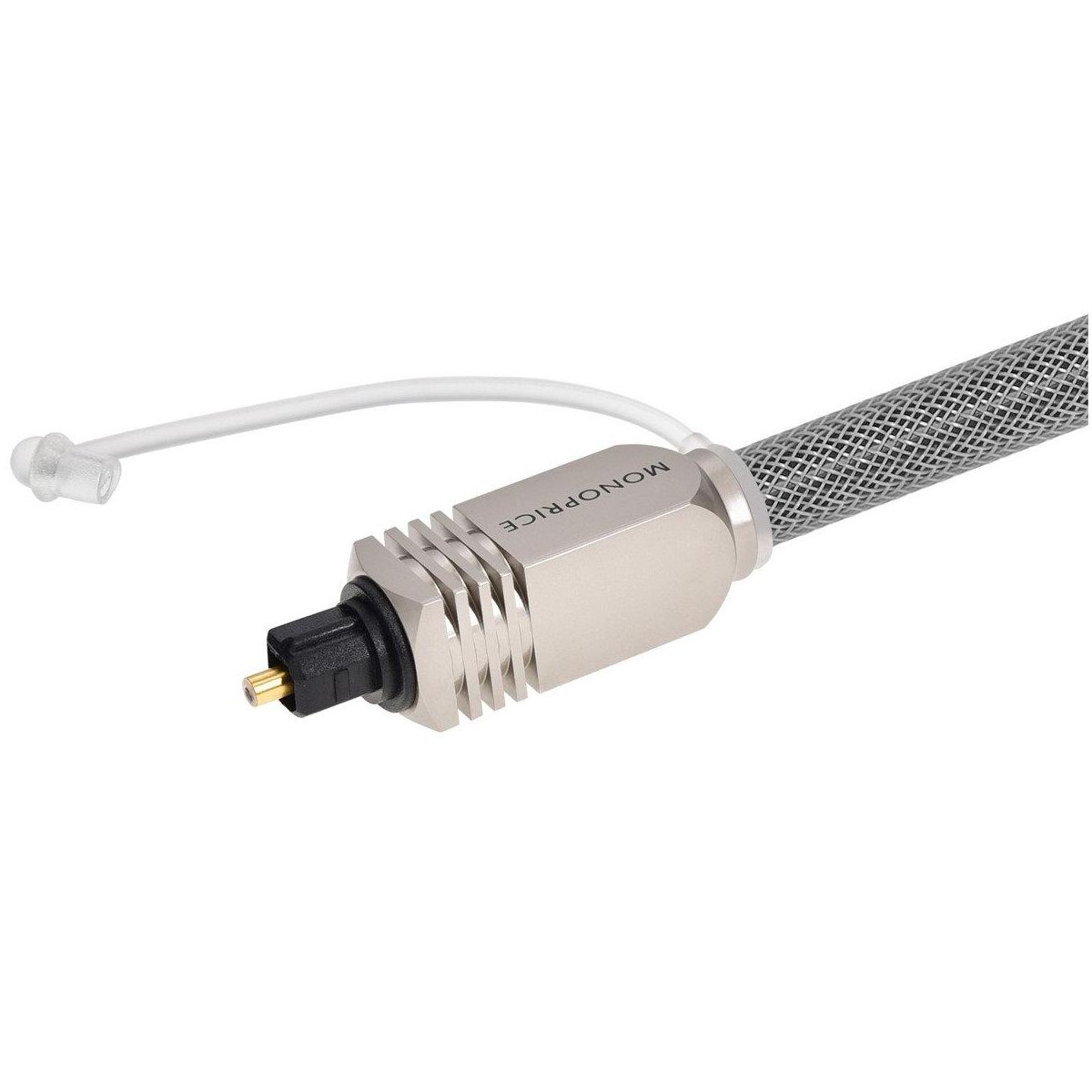 Experience superb sonic clarity and accurate musical reproduction with this Premium S/PDIF (Toslink) Digital Optical Audio Cable from Monoprice. The Sony/Philips digital interface format provides for a digital optical audio signal, commonly referred to as Toslink. Toslink allows for the distribution of uncompressed 2-channel PCM audio or compressed multichannel audio, such as DTS or Dolby 5.1 or 7.1. Being an optical signal, Toslink is immune to problems that can plague electrical signals, such as crosstalk, magnetic interference, or radio frequency interference. This premium cable features a full-sized Toslink connector on each end, with metal connector heads and a metal mesh jacket. The metal jacket helps protect the cable from nicks, cuts, and kinks, which could cause damage to the internal optical fiber.