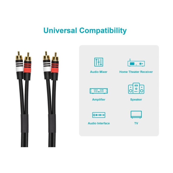 Despite the introduction of more advanced audio and video signal cables, such as HDMI and Toslink, most audio and a large number of video connections still use the common RCA connector. This is a premium two-channel audio cable made of RG-59 75 ohm coaxial cable. The cable uses a 22awg conductor and is shielded to prevent EMI or RFI interference from entering your audio system. The connectors are gold plated, for smooth connections and to prevent corrosion. Each connector head features embedded, color-coded rubber rings to ensure a firm grip when installing or removing the cable.