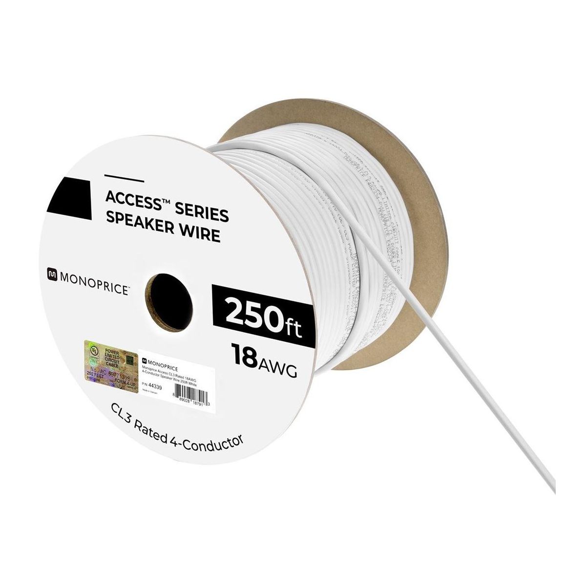 Monoprice Speaker Wire, CL3 Rated, 4-Conductor, 18AWG, 250ft, White