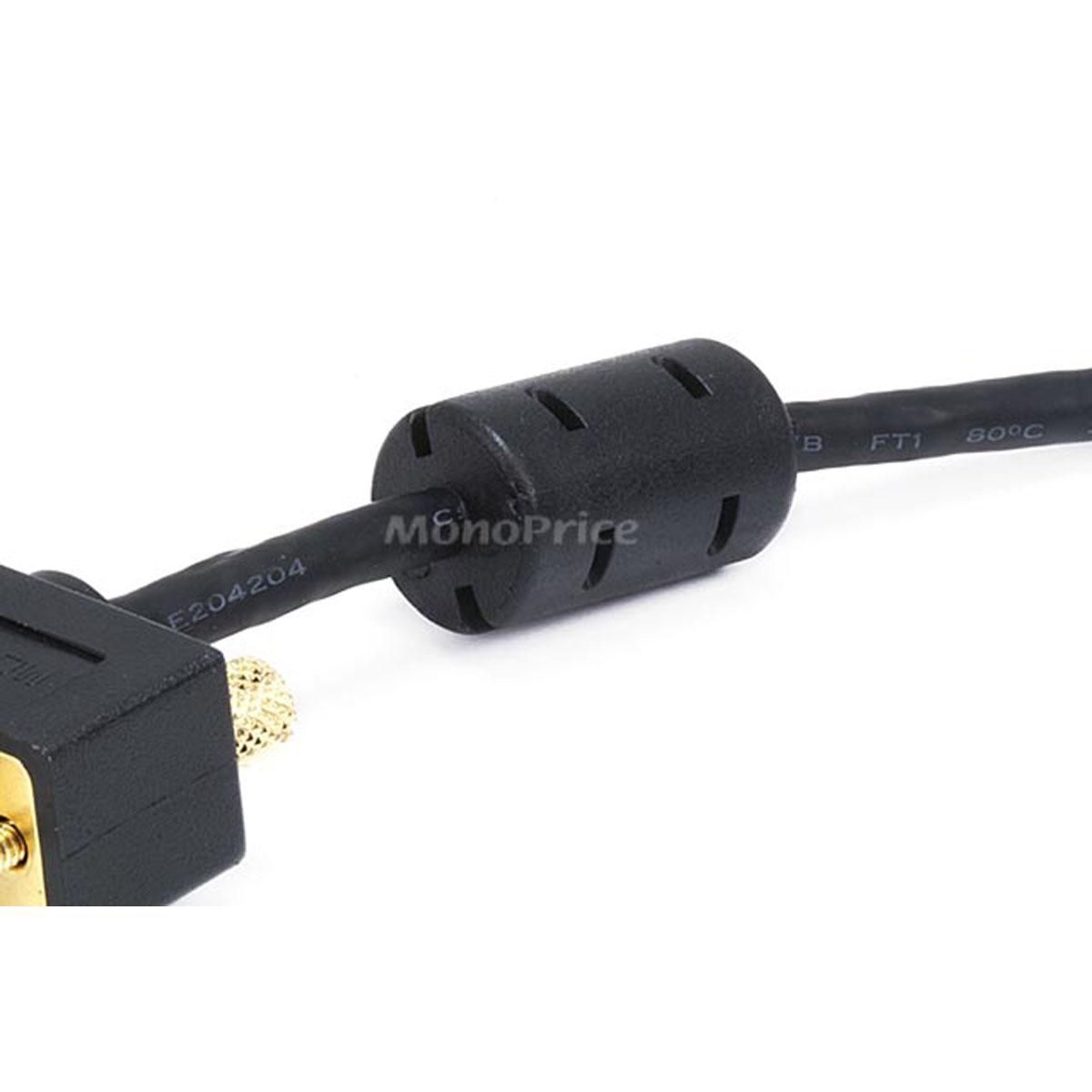 Despite the introduction of DVI and HDMI, the common VGA connection is still the primary connection for most computer monitors. This ultra slim cable is designed to handle analog VGA and extended VGA resolutions. The conductors for the three color lines are 30AWG coaxial, while the remaining conductors are 32AWG stranded wire. The cable features a male DE-15 (aka HD-15 or DB-15) connector on one end and a female DE-15 connector on the other end, each gold plated for smooth, corrosion-free connections. It includes ferrite cores at each end, which ensure that EMI and RFI interference will not enter your video system.