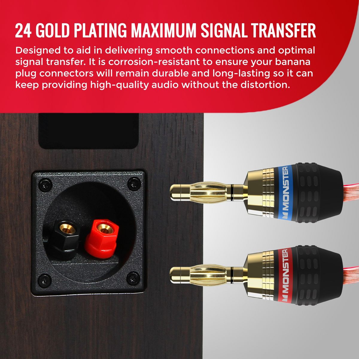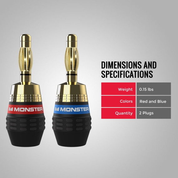 The Monster QuickLock connectors are the fastest and easiest way for you to install the right connector to your speaker cable for maximum performance and reliability.Through Monster's advanced cable technologies, these Banana QuickLock Connectors feature precision machined 24K gold contacts that resist corrosion and maximize conductivity and avoid signal interference. Constructed with a screw-on design for easy and reliable crimpless and self crimping termination, our Banana Connectors have special gripping teeth and ring-locks so you can hold the speaker cable in place and keep them secure, and a wider base which minimizes shorting for maximum signal transfer.With the Monster QuickLock Connectors, you can get the best connection from speaker cable to receiver and get the most out of your home audio system.