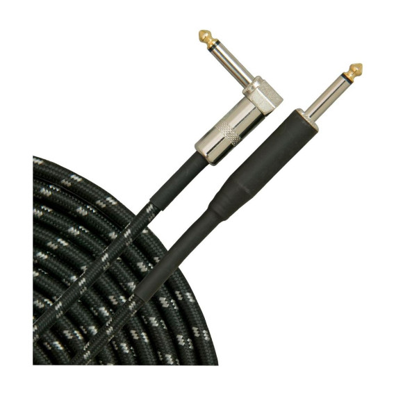 The Musician's Gear tweed right angle instrument cable combines durability, performance, and vintage style to meet the needs of serious players. Featuring oxygen-free copper wire, this cable ensures clear signal transmission with minimal interference, making it ideal for electric guitar, bass guitar, or keyboard setups. Its rugged construction includes heavy-duty heatshrunk tubing for strain relief, providing long-lasting reliability during demanding gigs or recording sessions. The stylish tweed wrap adds a classic aesthetic that complements any instrument or amp, while the gold-tipped right-angle connectors offer secure connections and a sleek, professional look.