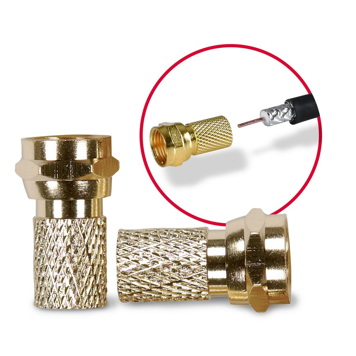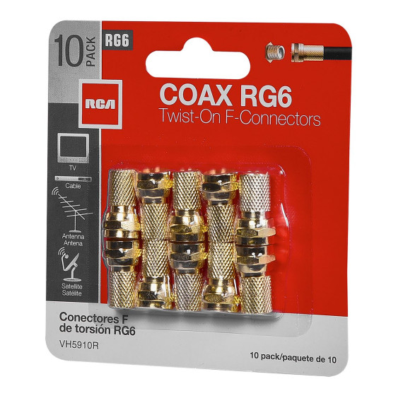 The RCA VH5910R Gold-Plated RG Twist-on F-Connectors terminate RG6 coaxial cable. They are easy to install to make your own custom coaxial cable lengths. Simply strip off 1/2 in. of black cable insulation, strip off 3/8 in. of insulation and braiding to expose 3/8 in. of center conductor, then fold back the remaining 1/8 in. of braided shielding back over the black cable insulation in the direction away from the end of the cable. Constructed with durable materials, the F-connectors are gold plated and come in a 10-piece pack._