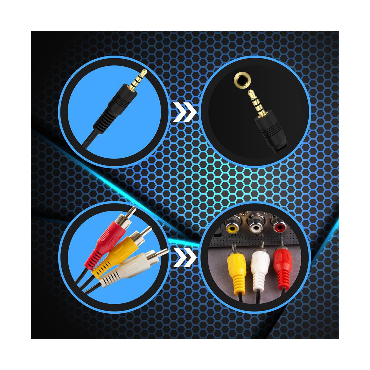 SatelliteSale 3.5mm Jack Plug Male to 3-Male RCA Audio Stereo Composite Universal Wire Cable (6 feet) connects your audio devices with its right and left plugs( white and red colors), transmitting clear audio. The central pin ( yellow color ) is used for composite video data. Our RCA cord is a perfect match for both residential and commercial use. Every cable we sell is an excellent cost-effective option. Our audio and video RCA composite cord is covered with a durable PVC jacket to protect it from unwanted bending damage and to increase its durability. Moreover, gold-plated connectors will resist oxidation and serve much longer. Enjoy the clarity of the sound and picture without any distortion and signal loss, even at extended lengths. Our Composite 6 feet Cable is compatible with a wide range of modern and previous versions of audio/video devices, such as DVD players, TVs, Wii boxes, VCRs, home theatre systems, gaming consoles, soundbars, speakers, subwoofers, Blu-Ray players, and AV receivers. Works like a charm with 3.5mm socket enabled video and photo cameras transmitting video to your TVs, screens, and monitors. Moreover, we assure the lifetime service of each cable to deliver a positive experience to our clients.