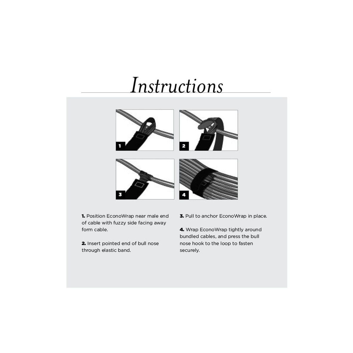 Available in a variety of widths and lengths, the EconoWrap with Elastic is great for controlling cables and cords.. An elastic loop securely fastens the EconoWrap to the cable. Can be easily uninstalled or moved.